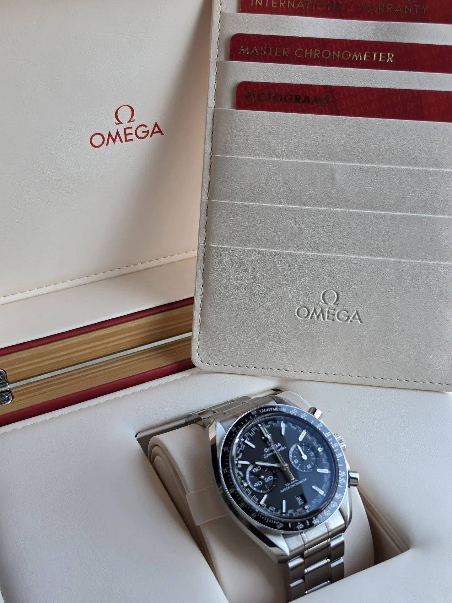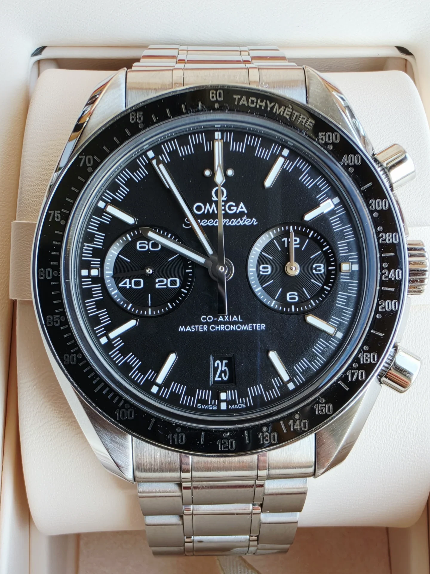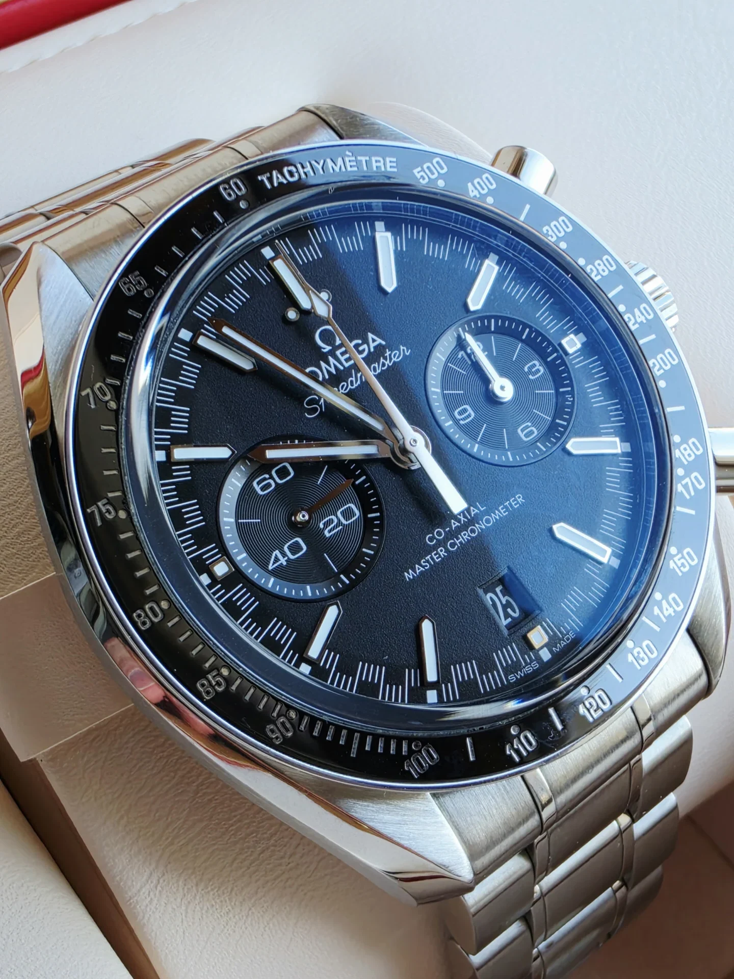 Wyrazista czarna tarcza o subtelnej fakturze została zaprojektowana z myślą o maksymalnej czytelności. Charakterystyczna, inspirowana wyścigami skala minutowa typu racing track otacza tarczę, nadając zegarkowi sportowego charakteru. Dwie lekko zagłębione subtarcze z czarnymi pierścieniami odpowiadają za wskazania chronografu, a okienko daty umieszczone na godzinie 6 zachowuje symetrię kompozycji. Pomarańczowe wskazówki oraz indeksy wypełnione Super-LumiNova zapewniają doskonałą widoczność w różnych warunkach oświetleniowych, natomiast pomarańczowe akcenty – m.in. napis „Speedmaster” i końcówka wskazówki sekundowej – podkreślają wyścigowy charakter modelu.