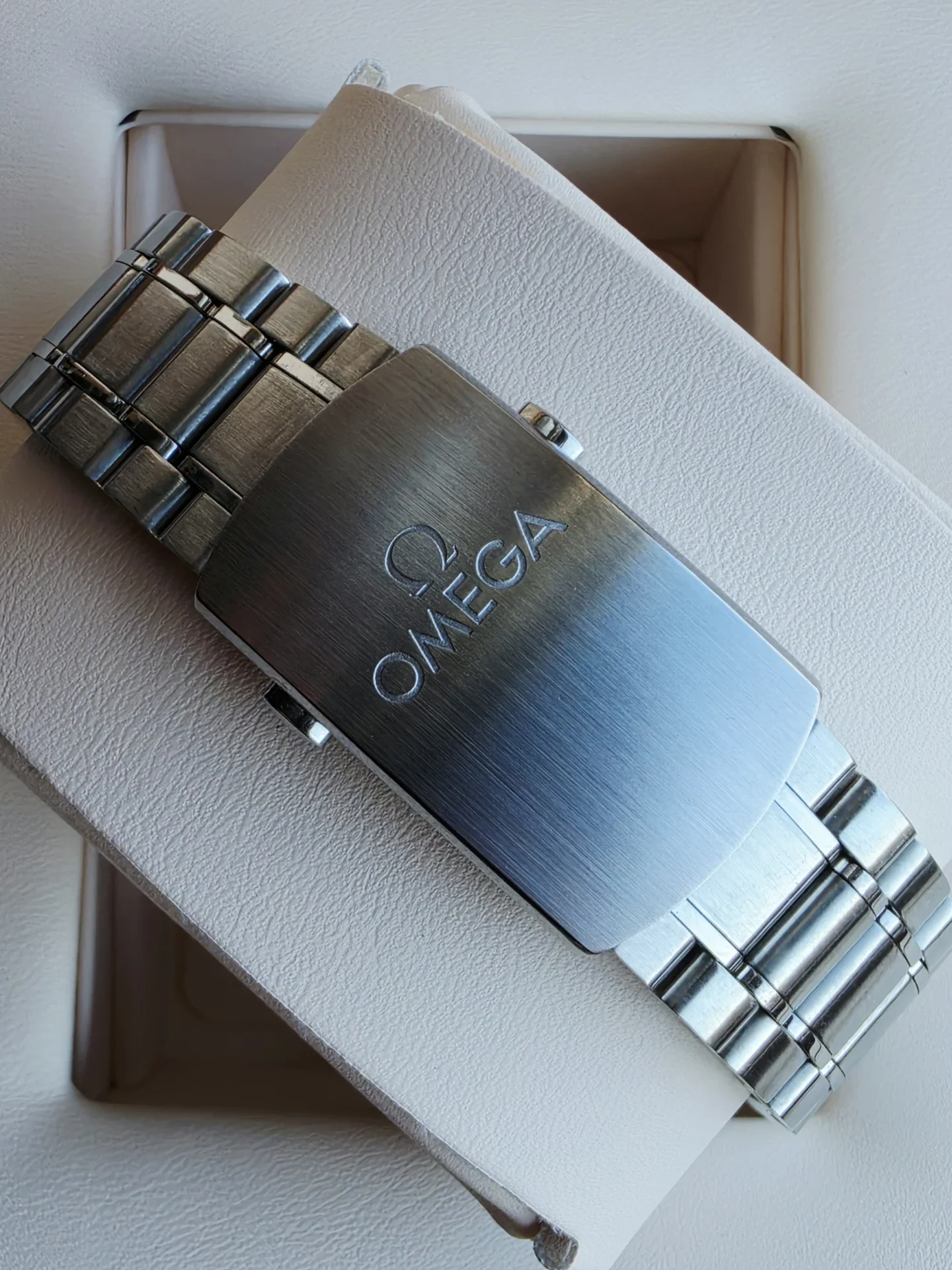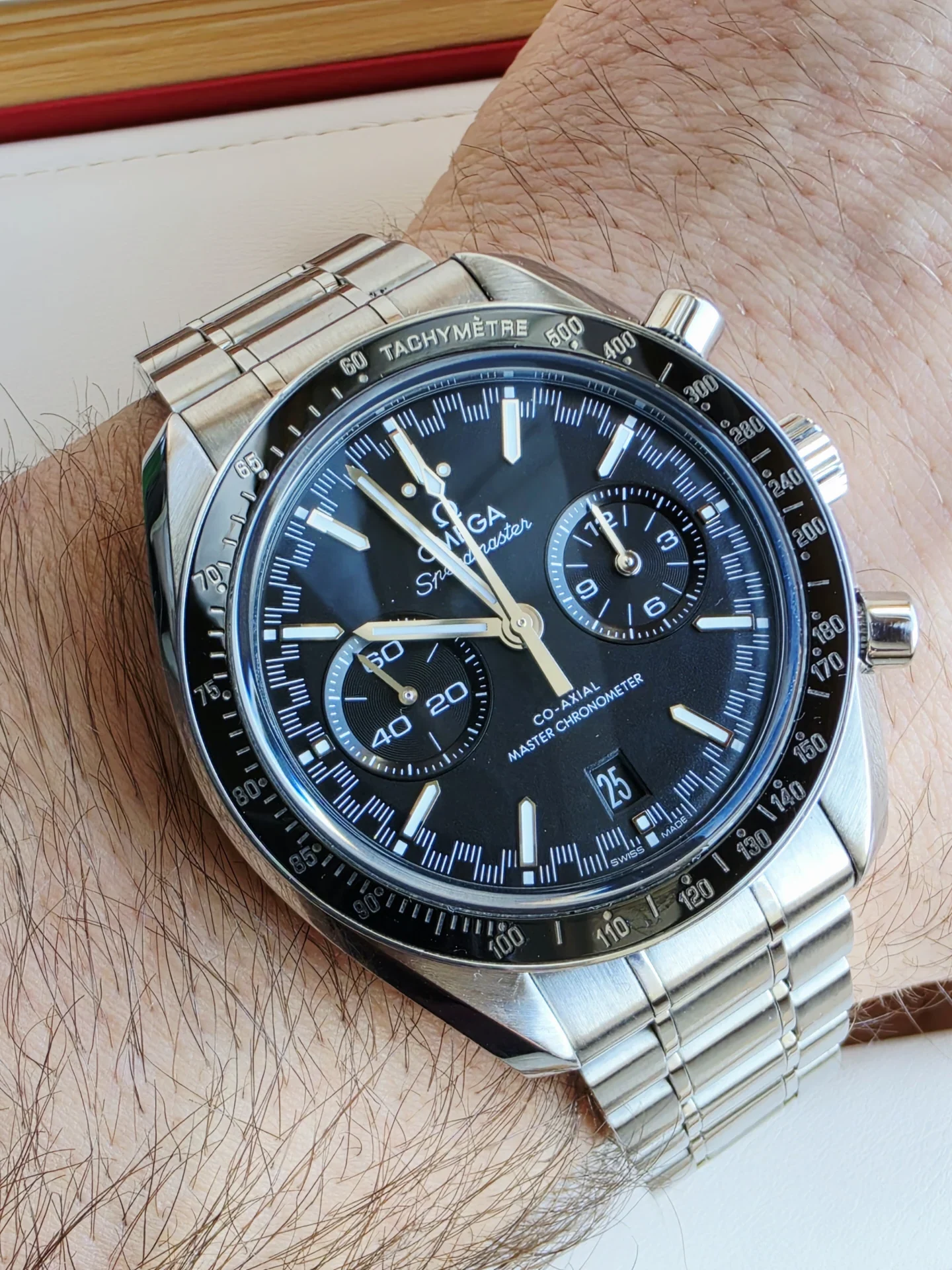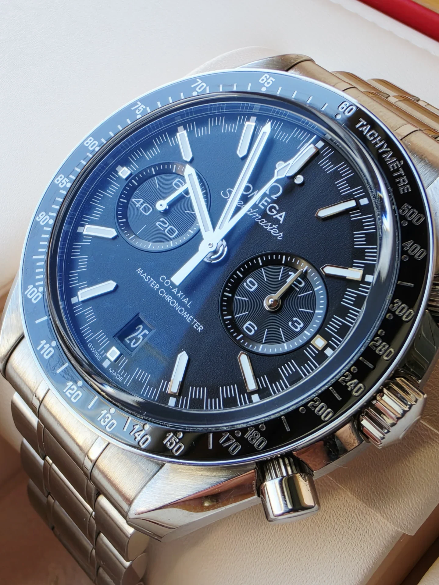 Wyrazista czarna tarcza o subtelnej fakturze została zaprojektowana z myślą o maksymalnej czytelności. Charakterystyczna, inspirowana wyścigami skala minutowa typu racing track otacza tarczę, nadając zegarkowi sportowego charakteru. Dwie lekko zagłębione subtarcze z czarnymi pierścieniami odpowiadają za wskazania chronografu, a okienko daty umieszczone na godzinie 6 zachowuje symetrię kompozycji. Pomarańczowe wskazówki oraz indeksy wypełnione Super-LumiNova zapewniają doskonałą widoczność w różnych warunkach oświetleniowych, natomiast pomarańczowe akcenty – m.in. napis „Speedmaster” i końcówka wskazówki sekundowej – podkreślają wyścigowy charakter modelu.