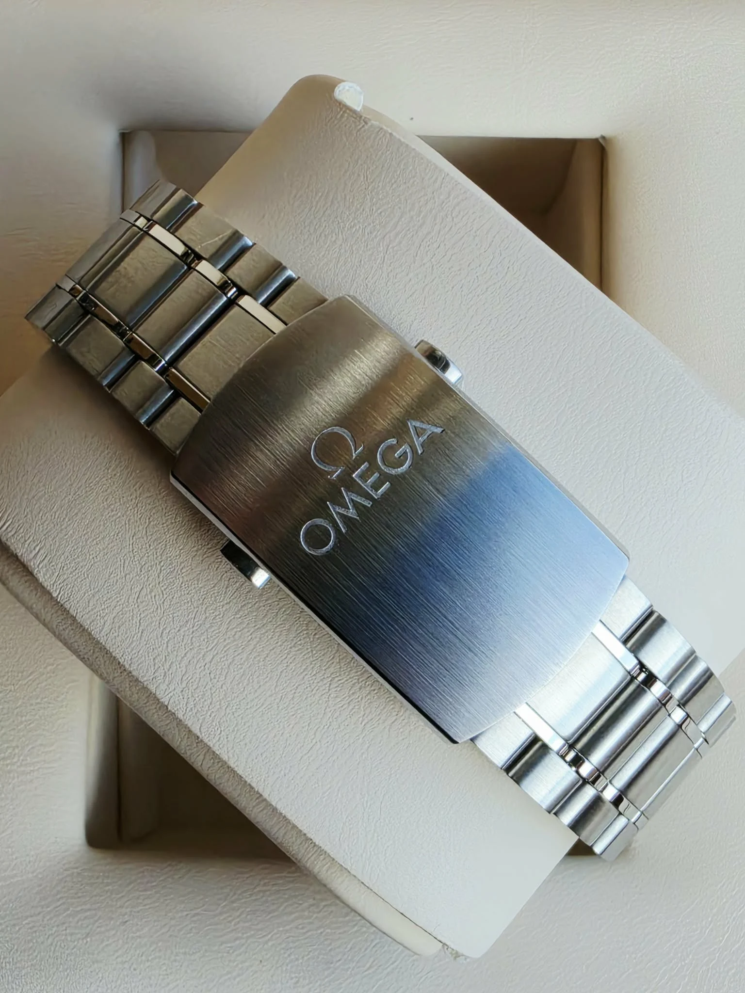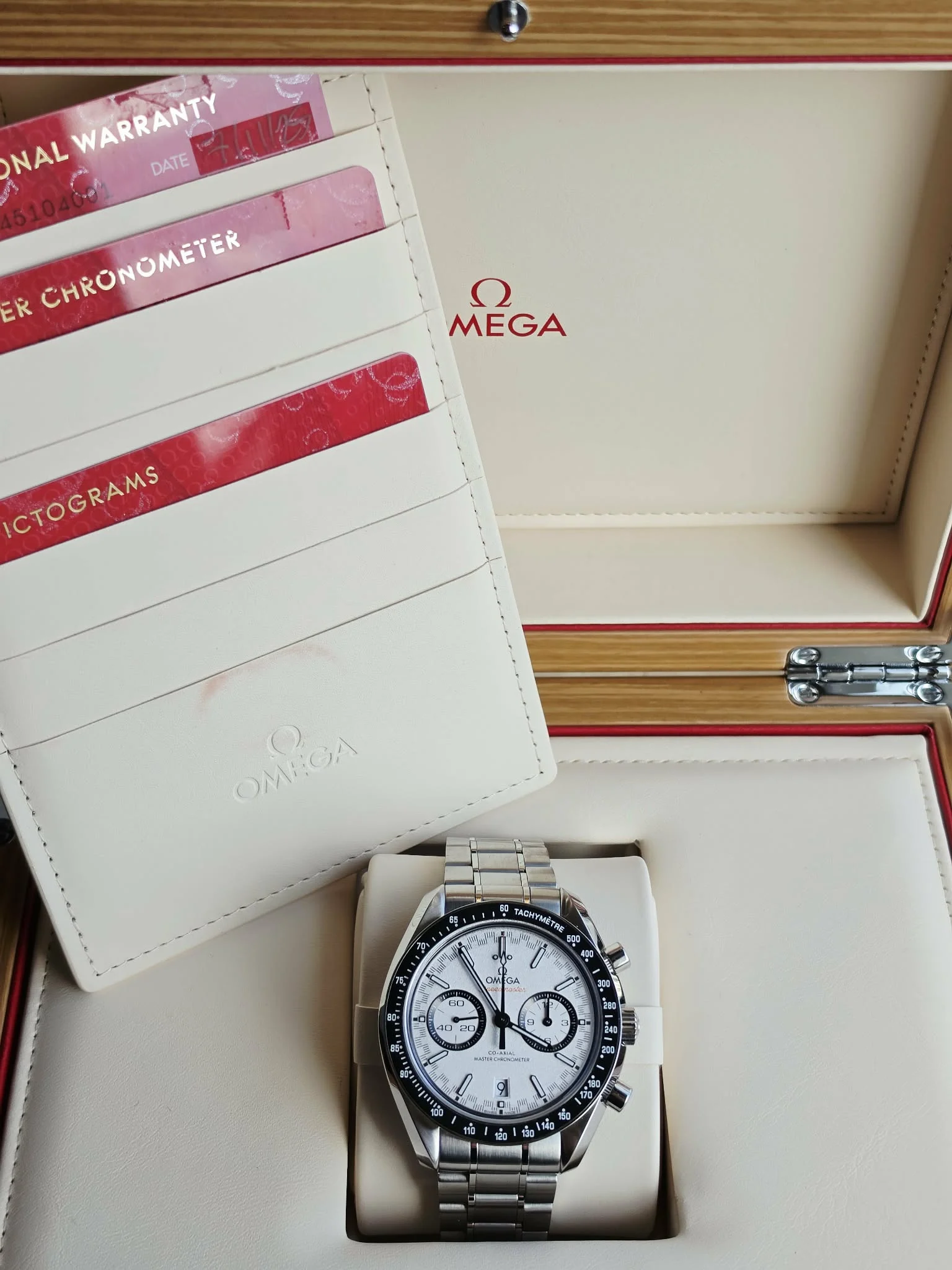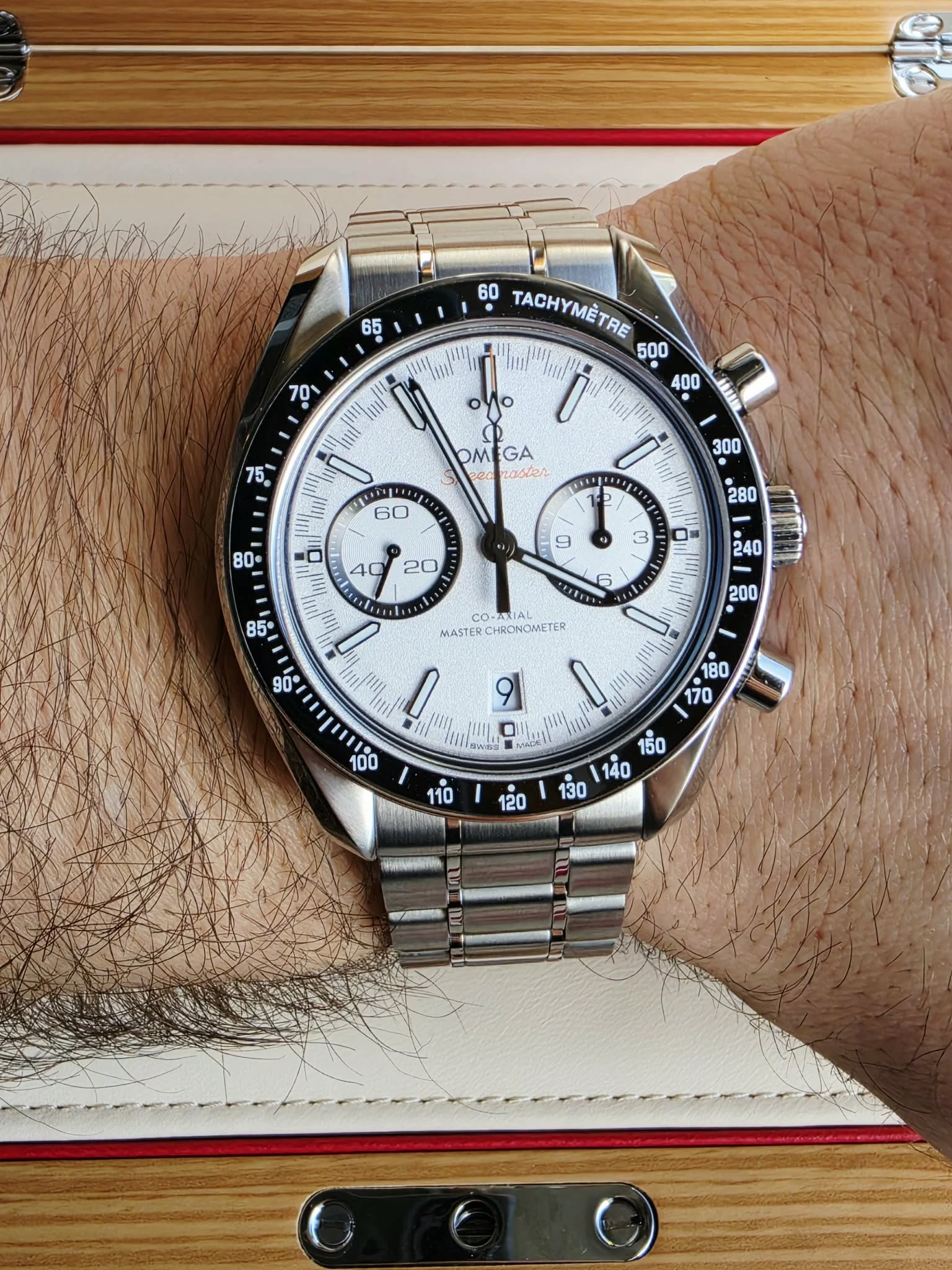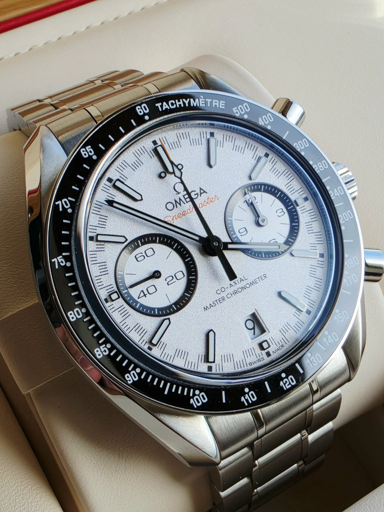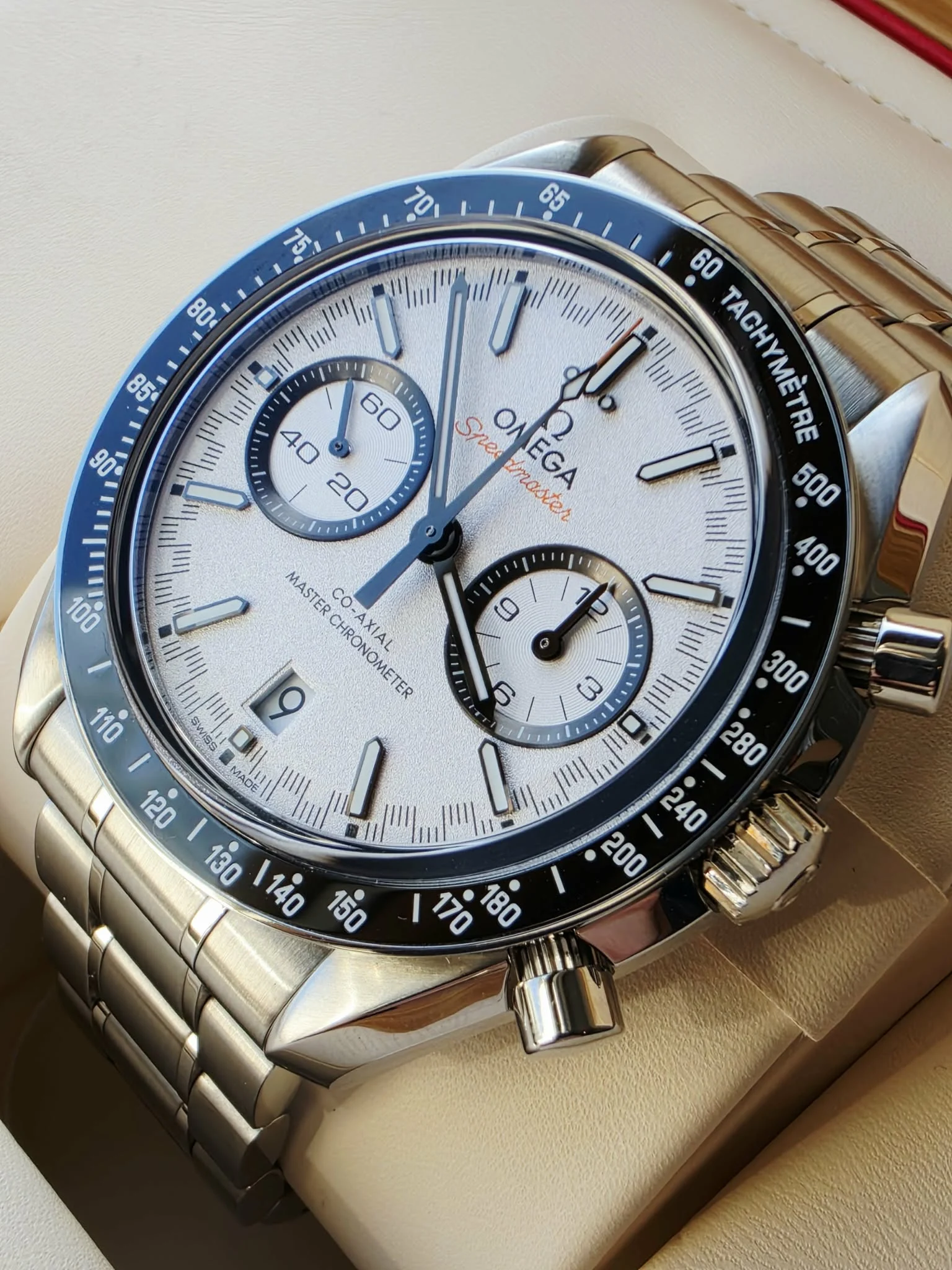 Wyrazista biała tarcza o subtelnej fakturze została zaprojektowana z myślą o maksymalnej czytelności. Charakterystyczna, inspirowana wyścigami skala minutowa typu racing track otacza tarczę, nadając zegarkowi sportowego charakteru. Dwie lekko zagłębione subtarcze z czarnymi pierścieniami odpowiadają za wskazania chronografu, a okienko daty umieszczone na godzinie 6 zachowuje symetrię kompozycji. Czernione wskazówki oraz indeksy wypełnione Super-LumiNova zapewniają doskonałą widoczność w różnych warunkach oświetleniowych, natomiast pomarańczowe akcenty – m.in. napis „Speedmaster” i końcówka wskazówki sekundowej – podkreślają wyścigowy charakter modelu.