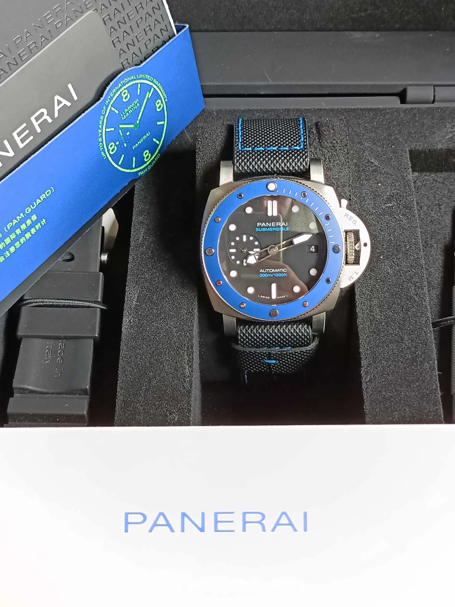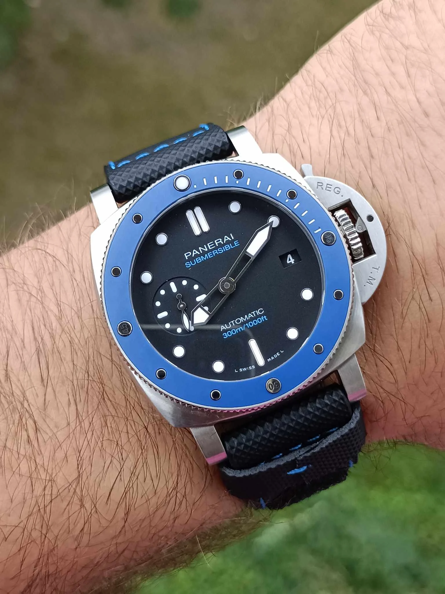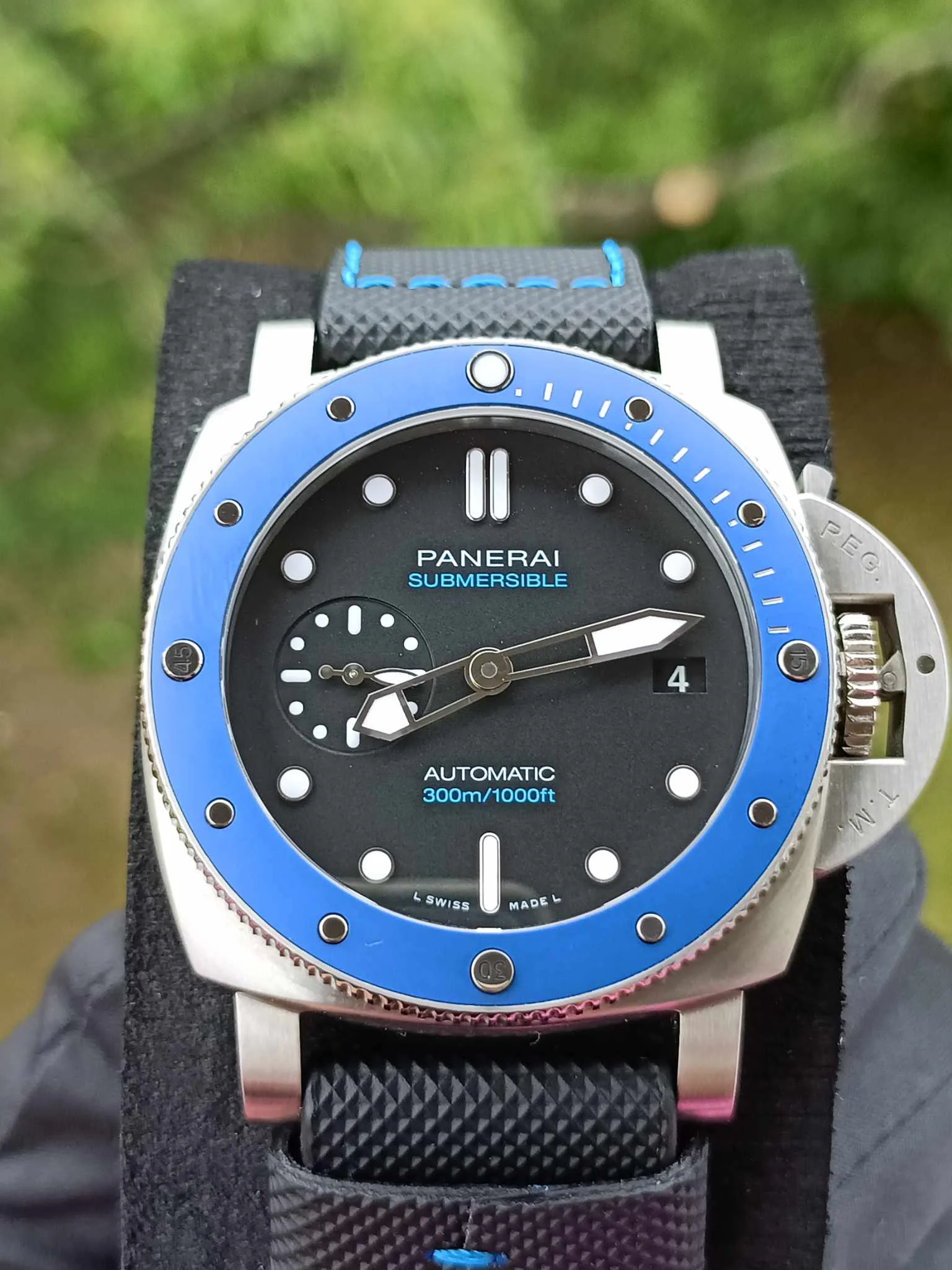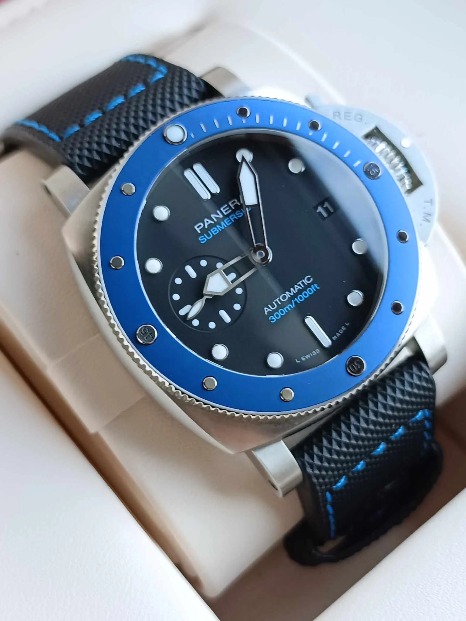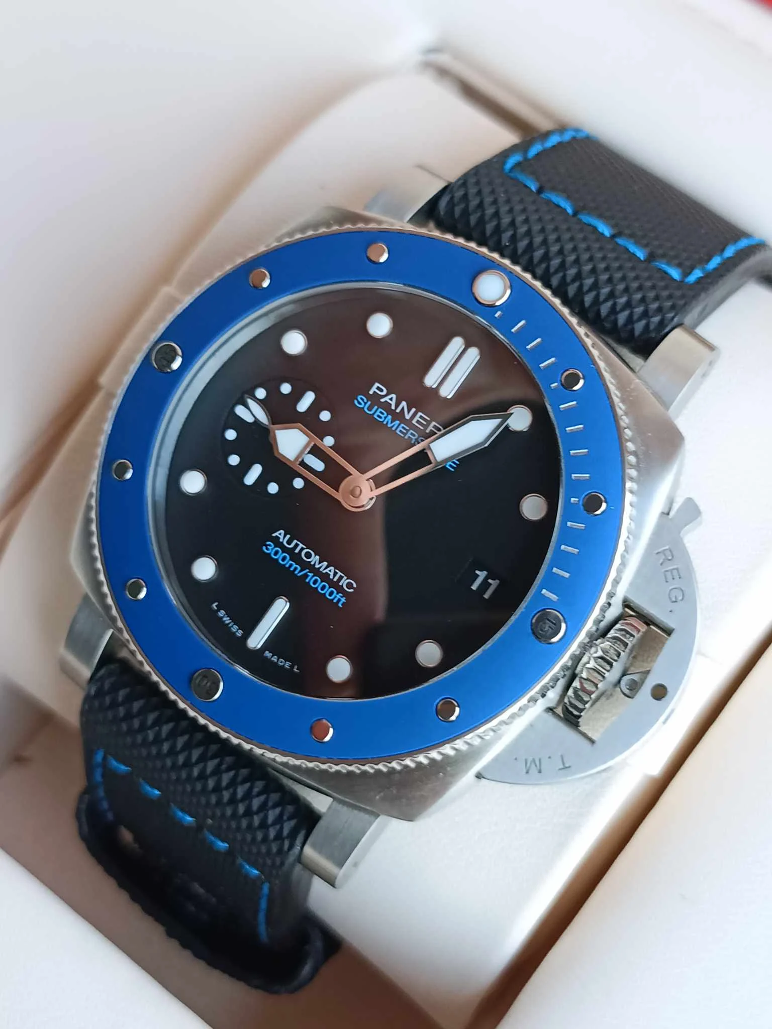 Tarcza w odcieniu azzurro – jasnego, morskiego błękitu – nadaje zegarkowi świeżości i nowoczesnej lekkości, jednocześnie zachowując legendarną czytelność marki. Duże, nakładane indeksy oraz charakterystyczne cyfry Panerai wypełniono substancją Super-LumiNova, zapewniając doskonałą widoczność w każdych warunkach oświetleniowych. Minimalistyczny układ tarczy, z małym sekundnikiem, podkreśla funkcjonalny, narzędziowy charakter zegarka.