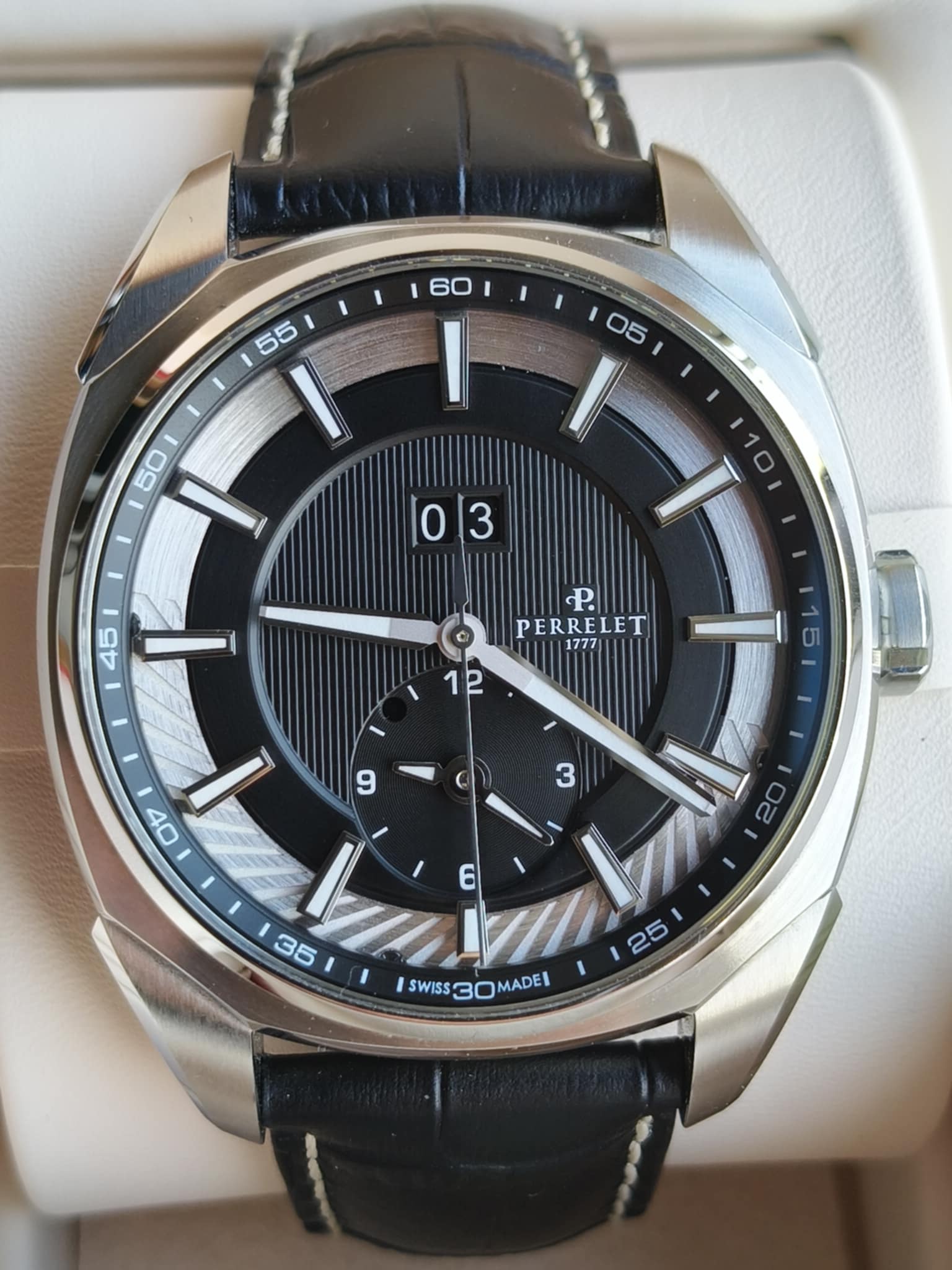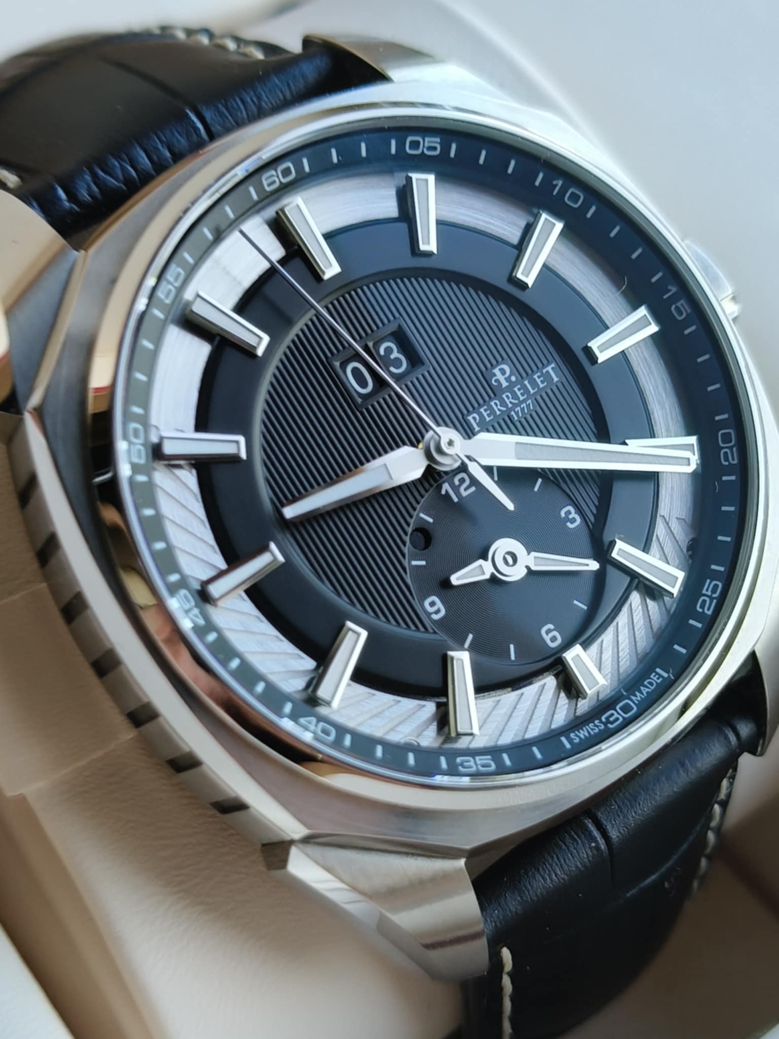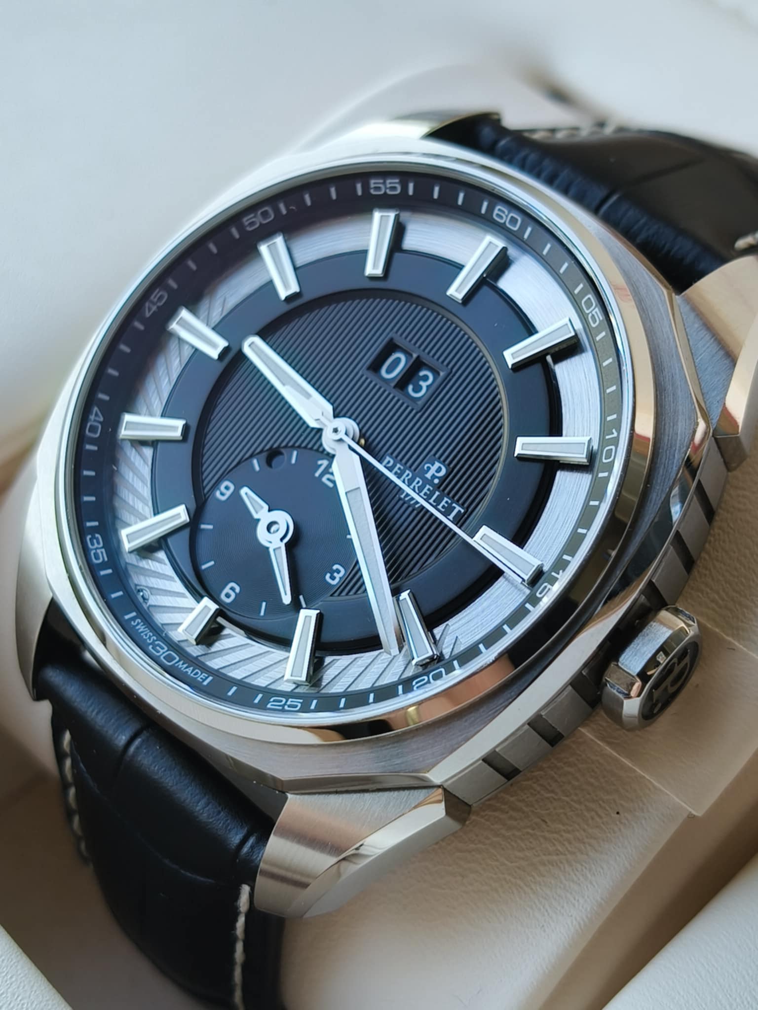 Srebrzysta tarcza z geometrycznym giloszowaniem i subtelnymi detalami odsłania unikatowy mechanizm z peryferyjnym rotorem – rozwiązanie techniczne, które zapewnia niezakłócony widok na pracę kalibru i jednocześnie gwarantuje wysoką wydajność naciągu. Smukłe wskazówki i indeksy podkreślają przejrzystość kompozycji, a całość uzupełnia elegancka koronka oraz dopracowane detale charakterystyczne dla manufaktury Perrelet.