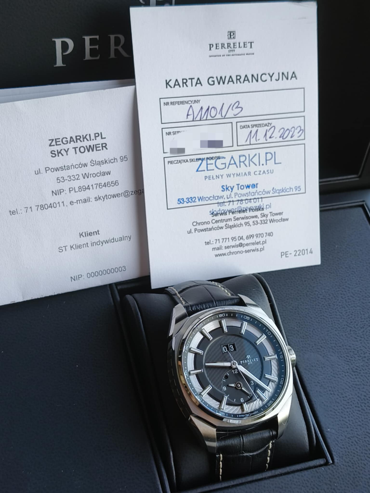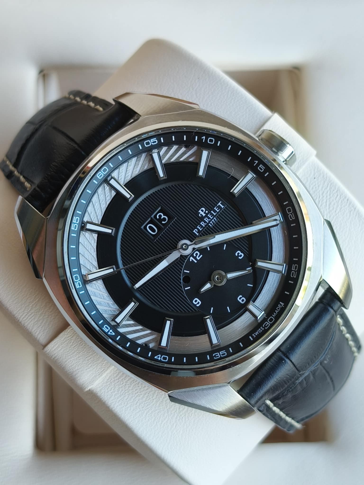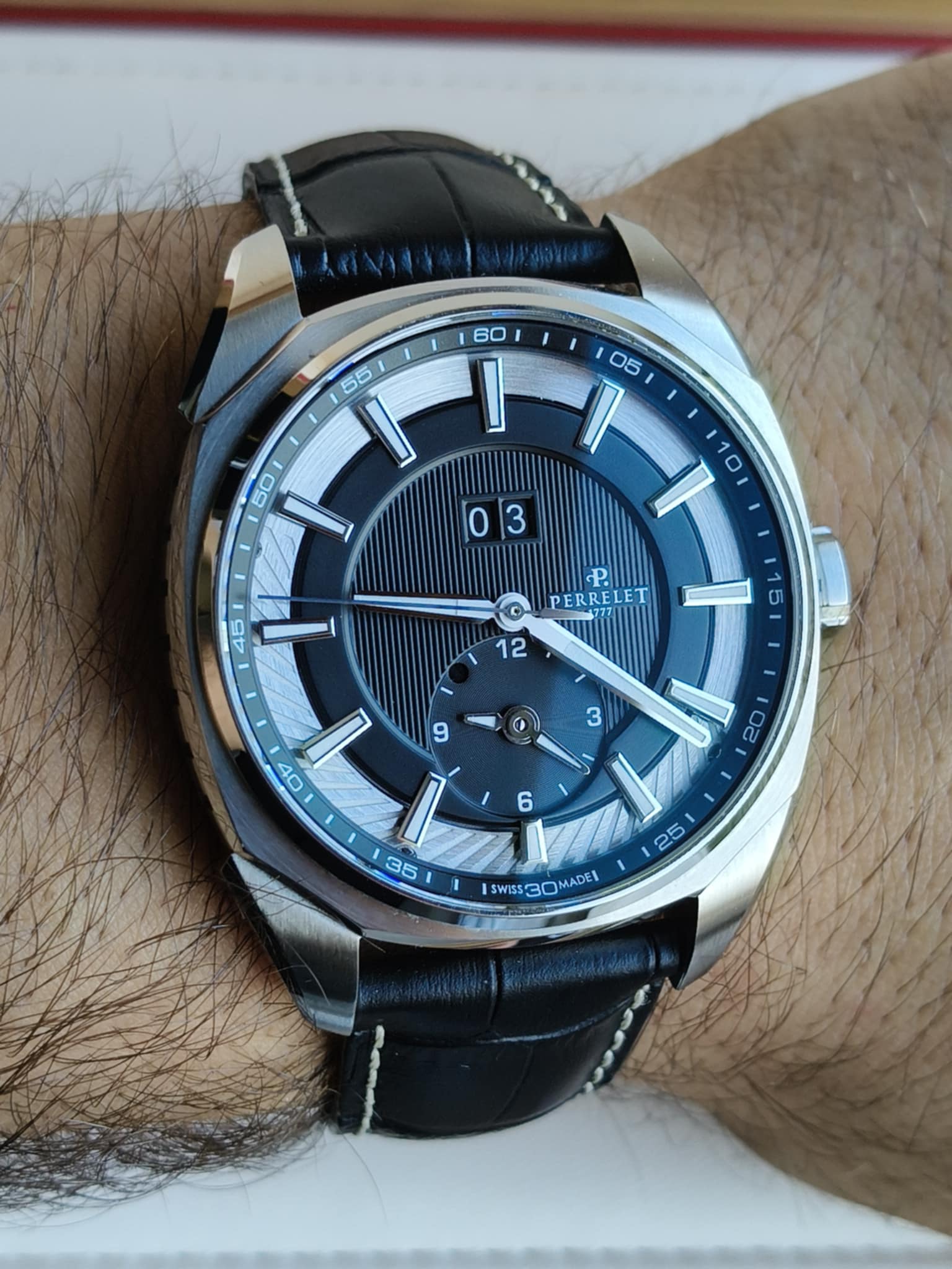 Srebrzysta tarcza z geometrycznym giloszowaniem i subtelnymi detalami odsłania unikatowy mechanizm z peryferyjnym rotorem – rozwiązanie techniczne, które zapewnia niezakłócony widok na pracę kalibru i jednocześnie gwarantuje wysoką wydajność naciągu. Smukłe wskazówki i indeksy podkreślają przejrzystość kompozycji, a całość uzupełnia elegancka koronka oraz dopracowane detale charakterystyczne dla manufaktury Perrelet.