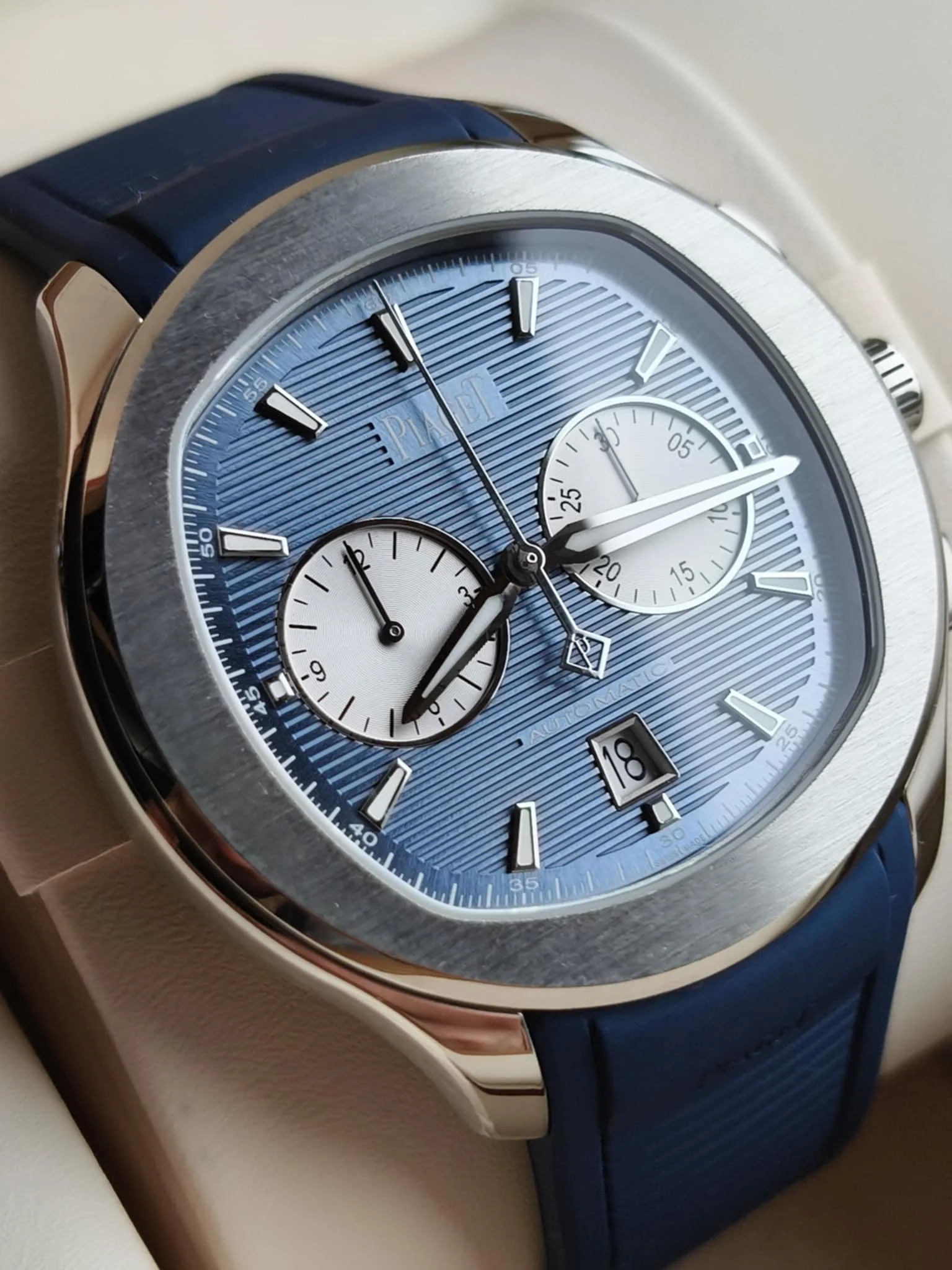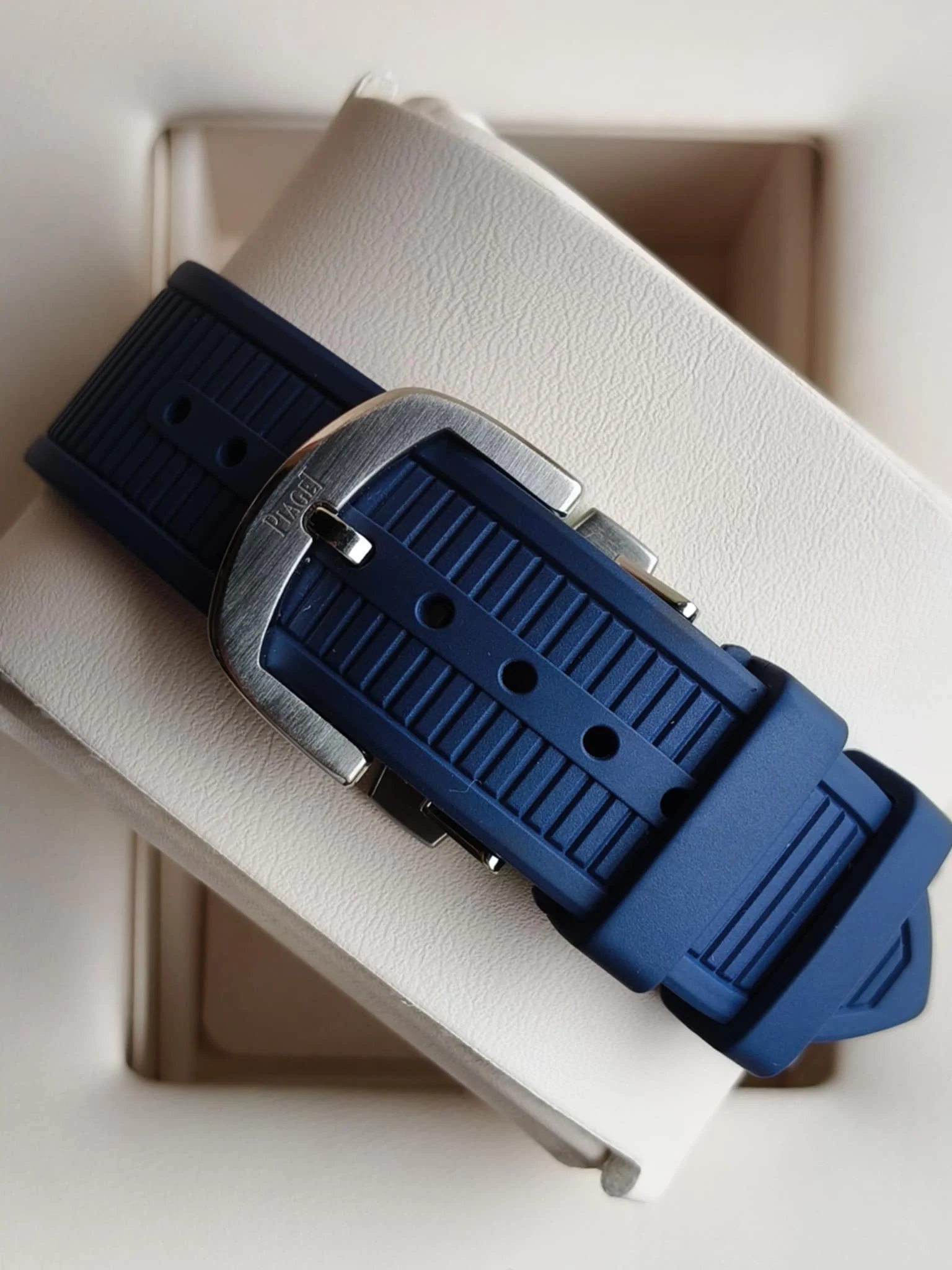 Model wyposażono w elegancki niebieski kauczukowy pasek z zapięciem motylkowym, która łączy komfort noszenia z luksusową estetyką, podkreślając sportowo-elegancki charakter zegarka. Precyzyjnie wykończony dekiel i dopasowana koronka dopełniają całości, akcentując dbałość o detale i wysoką jakość wykonania.