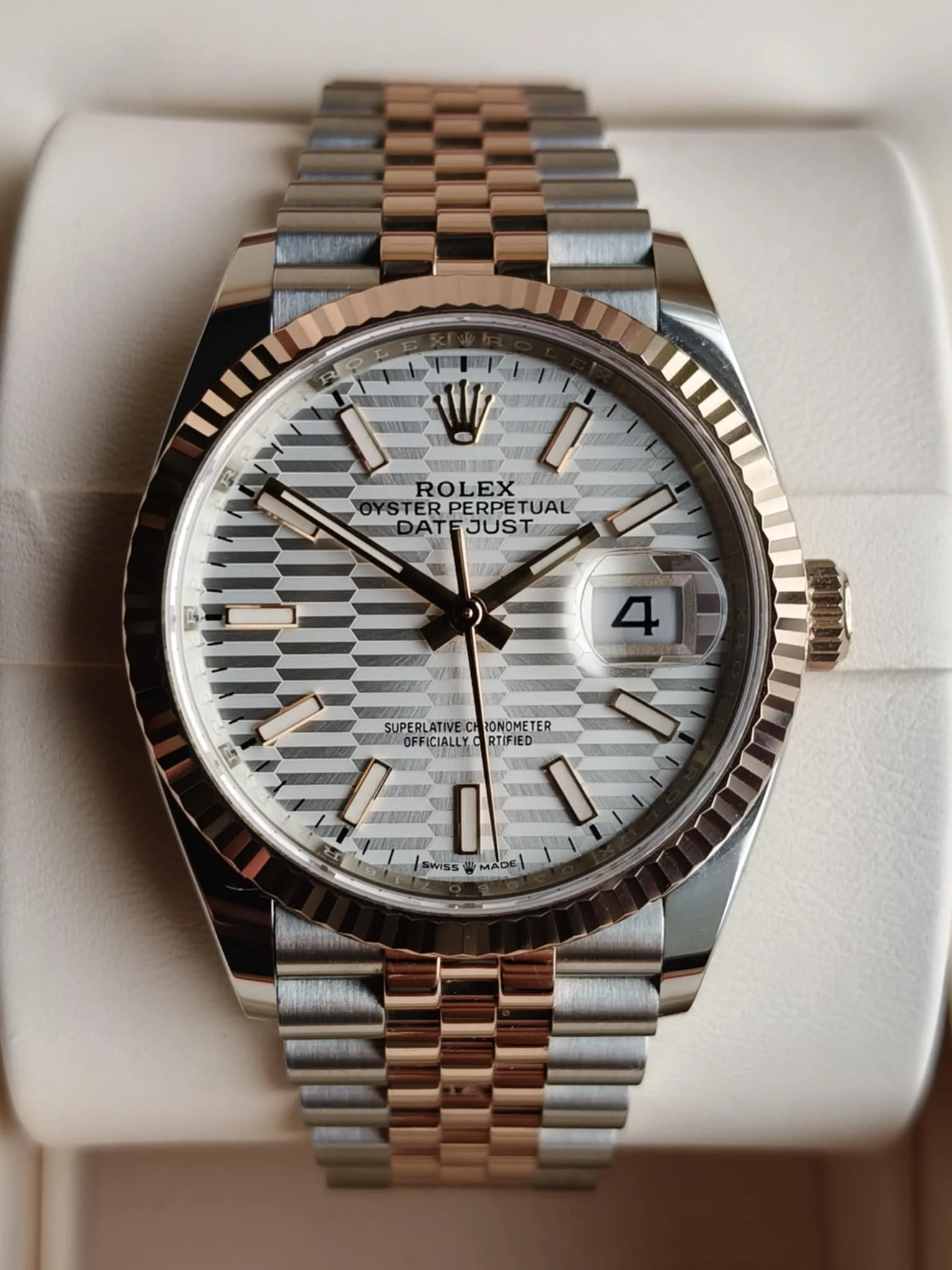 Centralnym punktem zegarka jest tarcza Fluted Motif — nowoczesna interpretacja klasycznego wzornictwa. Delikatny, promienisty wzór inspirowany żłobieniami bezela tworzy wyjątkową głębię i efekt gry światła, sprawiając, że tarcza zmienia swój charakter w zależności od kąta padania promieni. Dostępna w wyrafinowanych kolorach, tarcza zachowuje doskonałą czytelność dzięki starannie zaprojektowanym indeksom oraz wskazówkom, często wykonanym z 18-karatowego złota i pokrytym substancją Chromalight, zapewniającą doskonałą widoczność także w warunkach słabego oświetlenia. Kultowe okienko daty na godzinie 3, powiększone przez soczewkę Cyclops, pozostaje jednym z najbardziej rozpoznawalnych znaków Rolex Datejust.