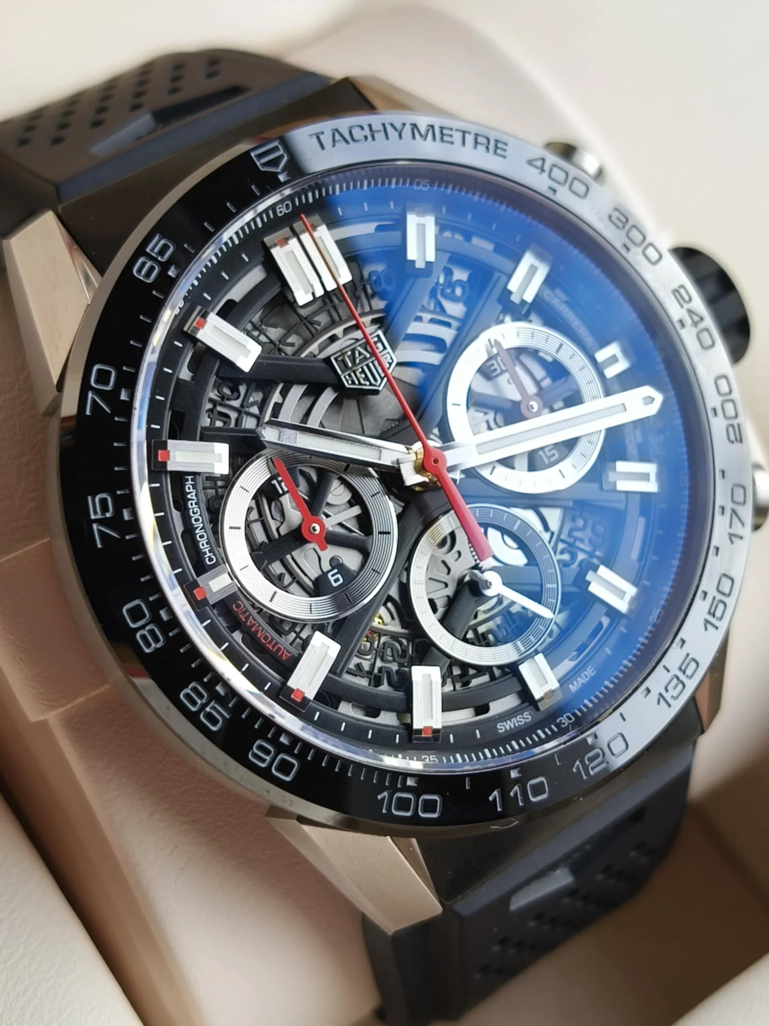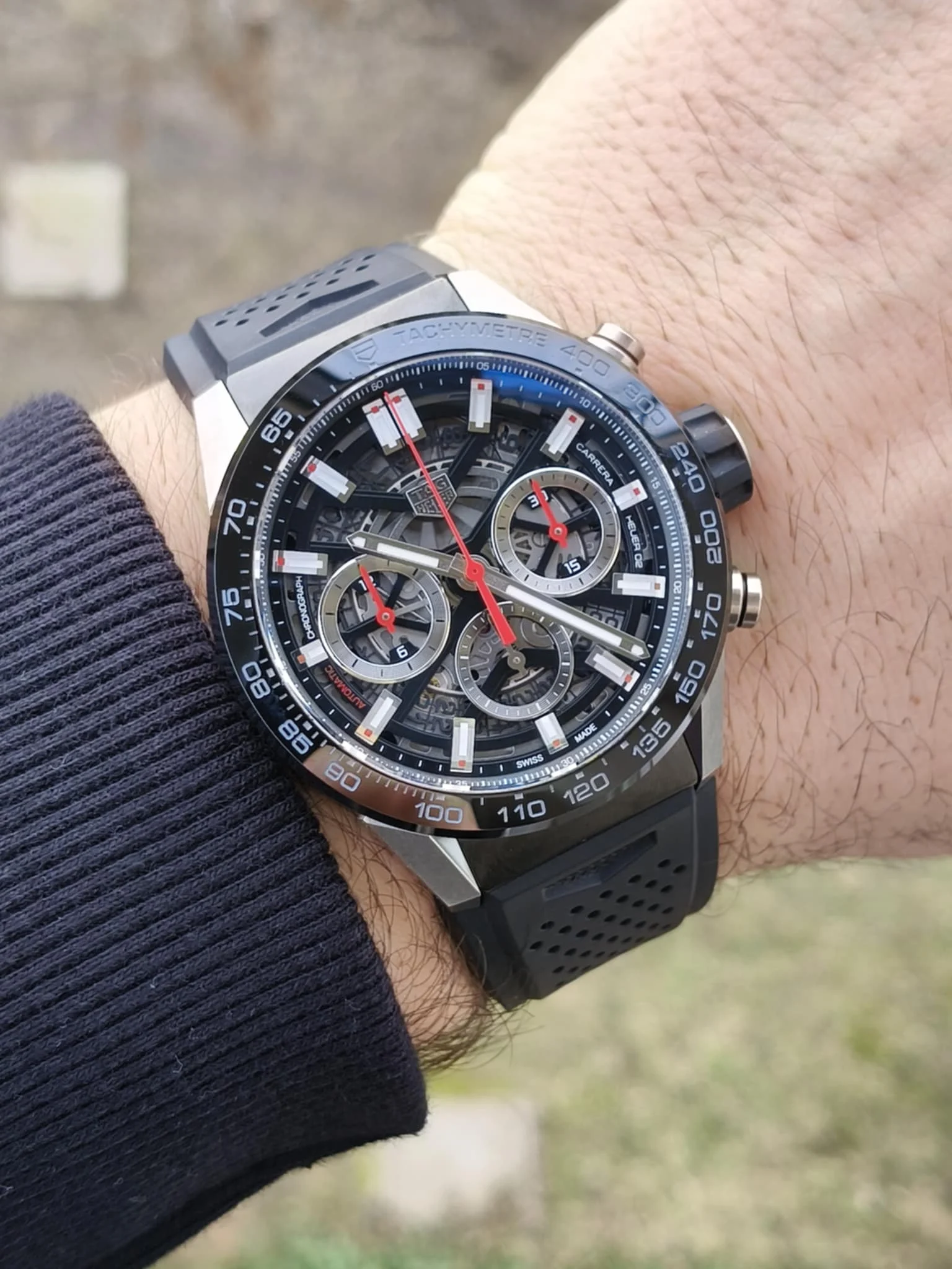 Sercem tego modelu jest manufakturowy mechanizm Calibre Heuer 02 z automatycznym naciągiem — zaawansowana konstrukcja TAG Heuer, która oferuje imponującą rezerwę chodu do około 80 godzin. Werk charakteryzuje się wysoką precyzją, stabilnością pracy i płynnym działaniem stopera, co czyni go wyjątkowo praktycznym w codziennym użytkowaniu. Otwarty pierścień tarczy oraz zastosowanie wysokiej jakości materiałów dodatkowo podkreślają techniczną doskonałość mechanizmu.