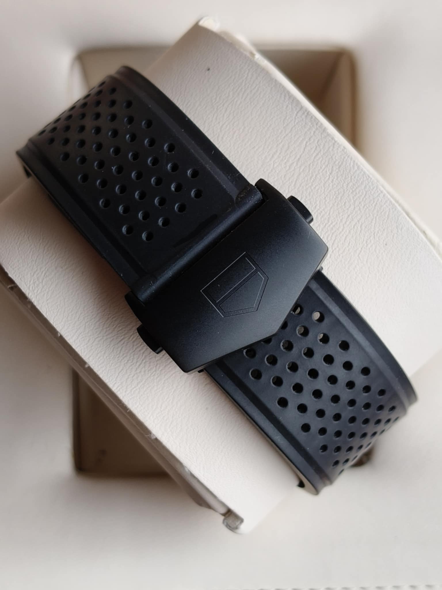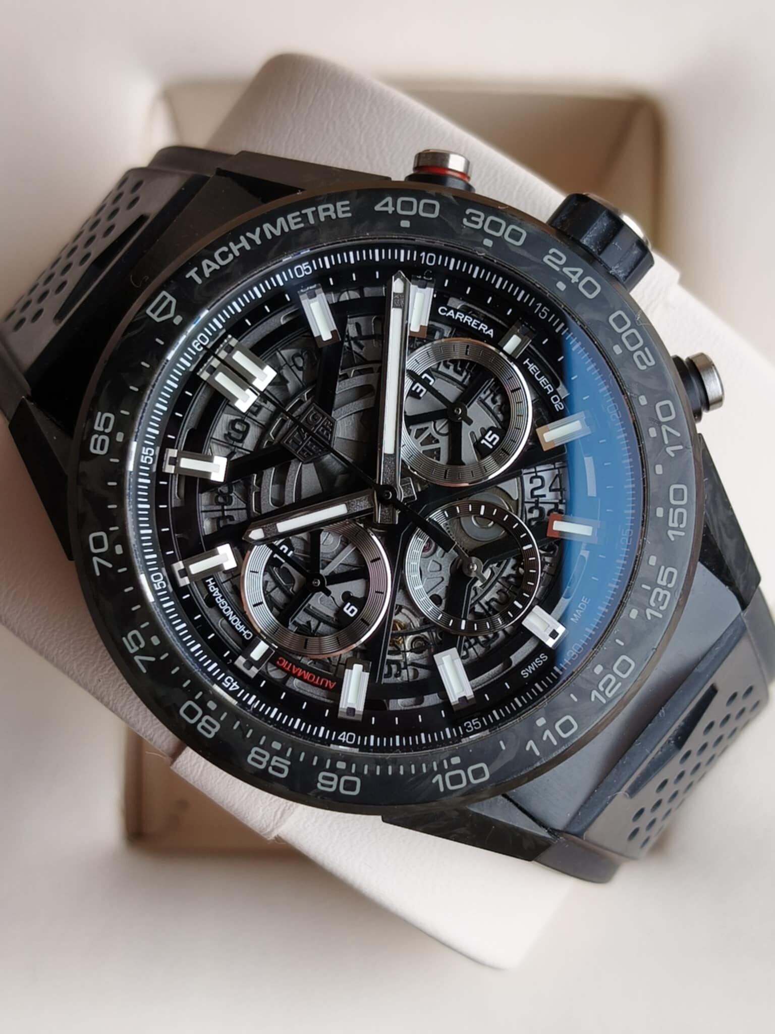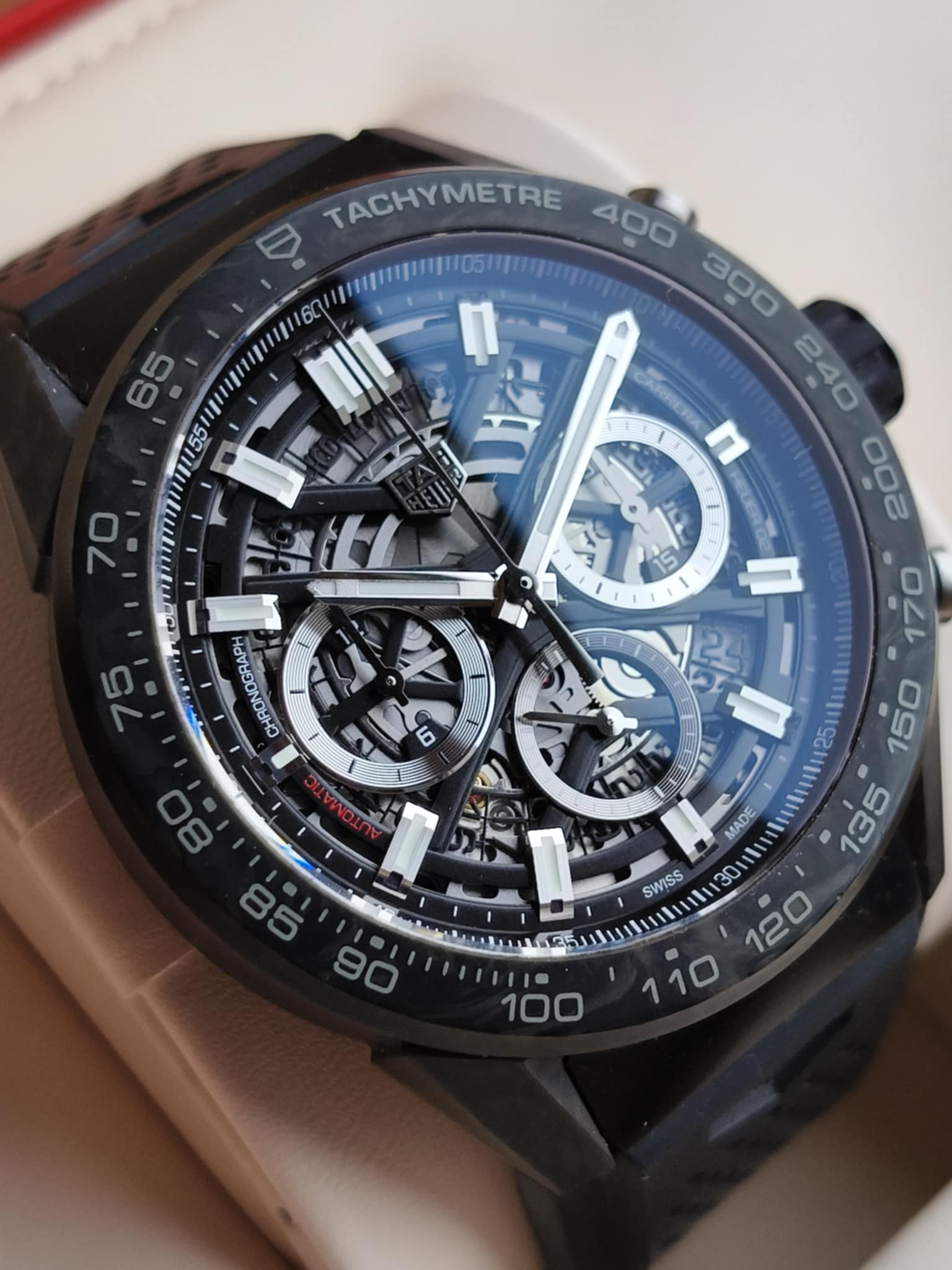 Tag Heuer Carrera Caliber Heuer 02 CBG2A91.FT6173 ma obudowę i ramkę z włókna węglowego, oferując lekką, ale wytrzymałą konstrukcję. Szkieletowana tarcza eksponuje skomplikowany mechanizm, a czarny perforowany pasek gumowy dodaje sportowego akcentu. Projekt zegarka jest inspirowany estetyką sportów motorowych, odzwierciedlając wyścigowe dziedzictwo TAG Heuer.