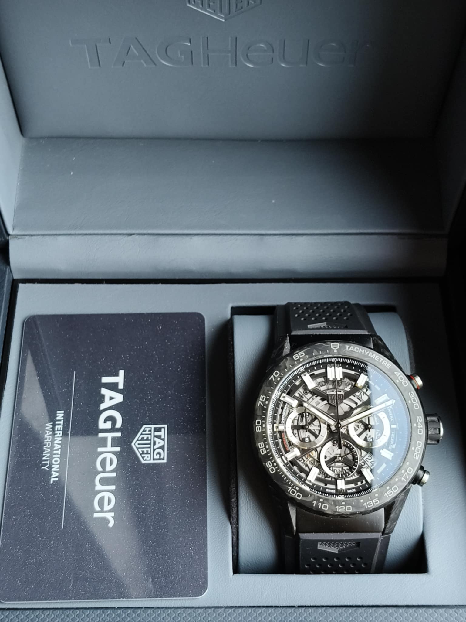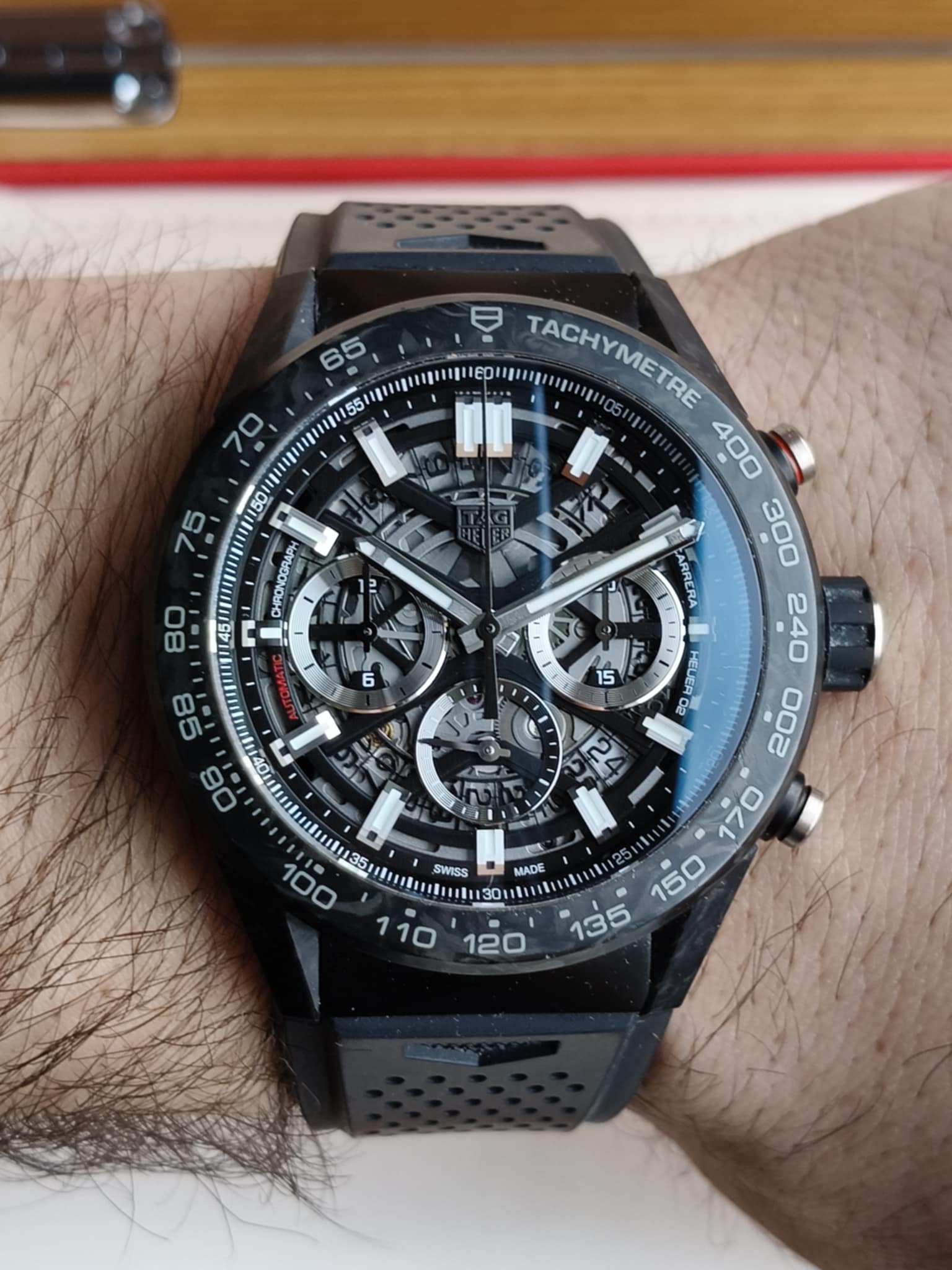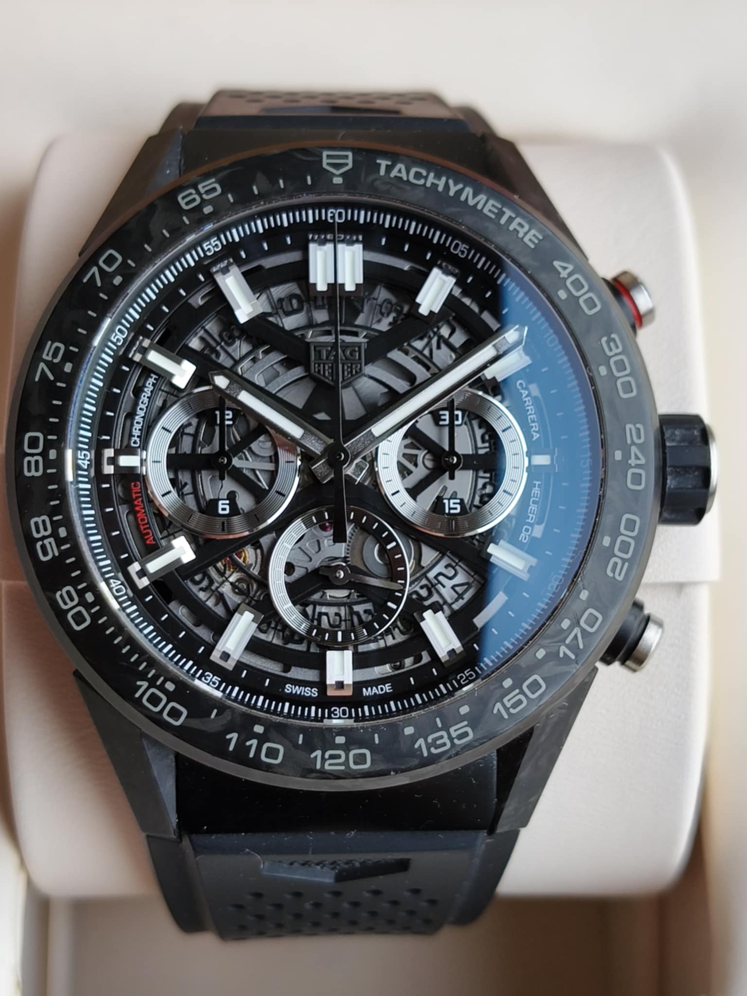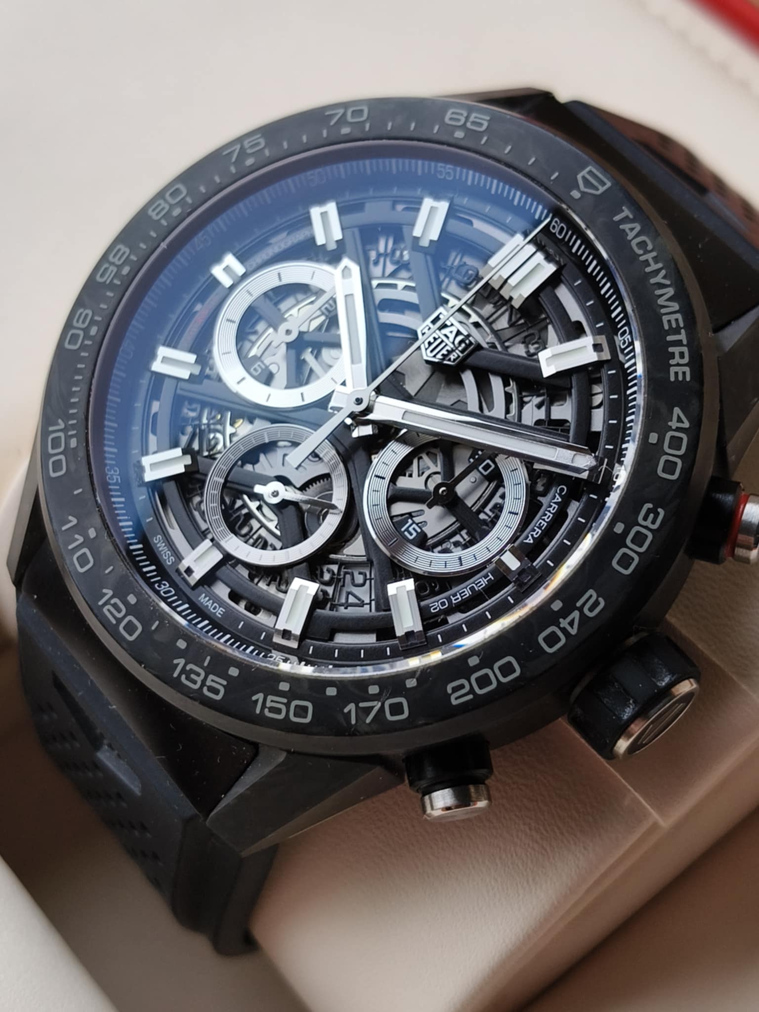 Tag Heuer Carrera Caliber Heuer 02 CBG2A91.FT6173 ma obudowę i ramkę z włókna węglowego, oferując lekką, ale wytrzymałą konstrukcję. Szkieletowana tarcza eksponuje skomplikowany mechanizm, a czarny perforowany pasek gumowy dodaje sportowego akcentu. Projekt zegarka jest inspirowany estetyką sportów motorowych, odzwierciedlając wyścigowe dziedzictwo TAG Heuer.