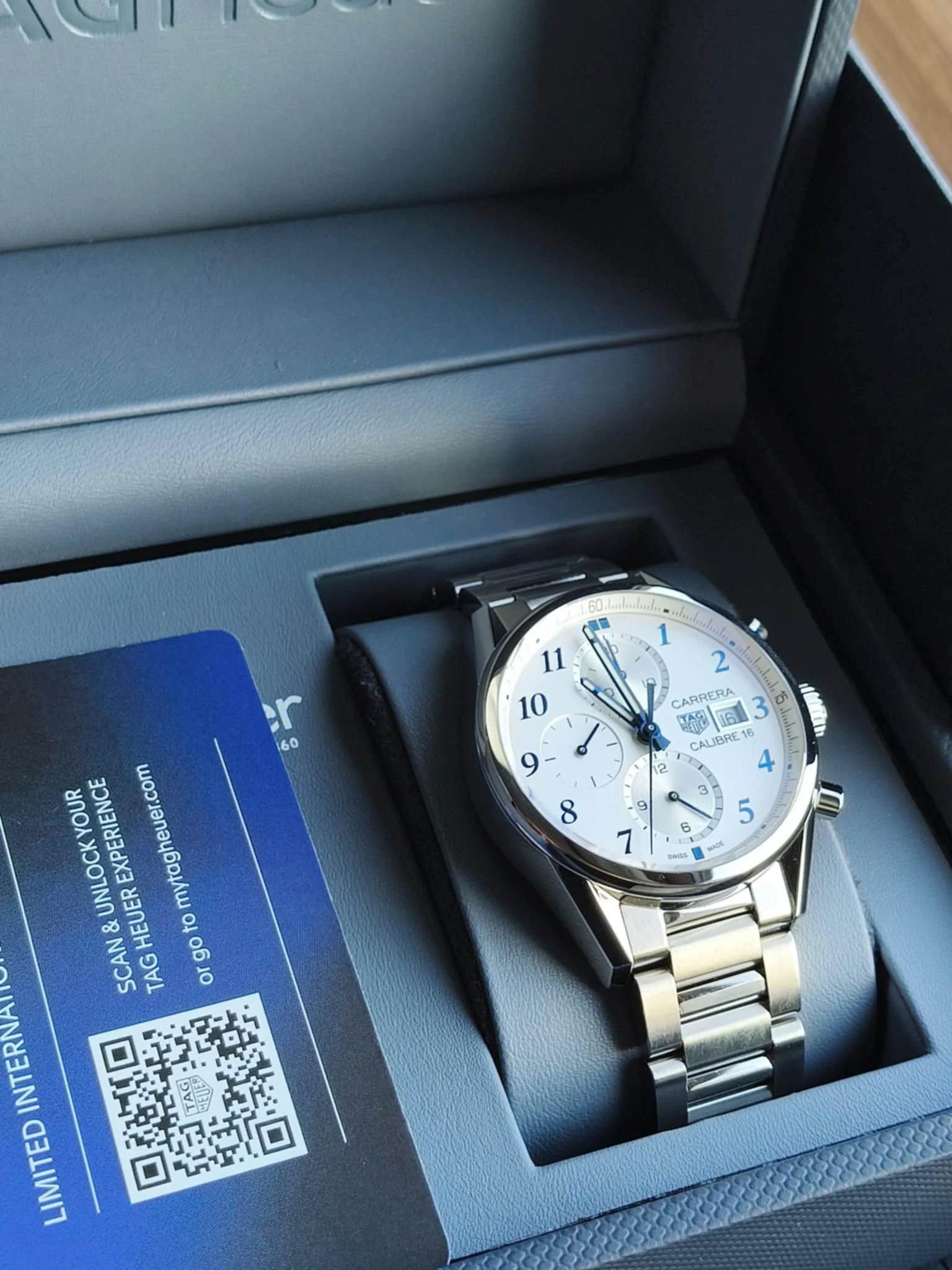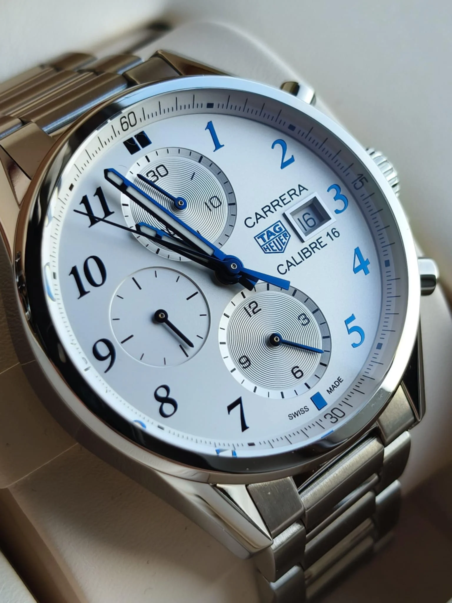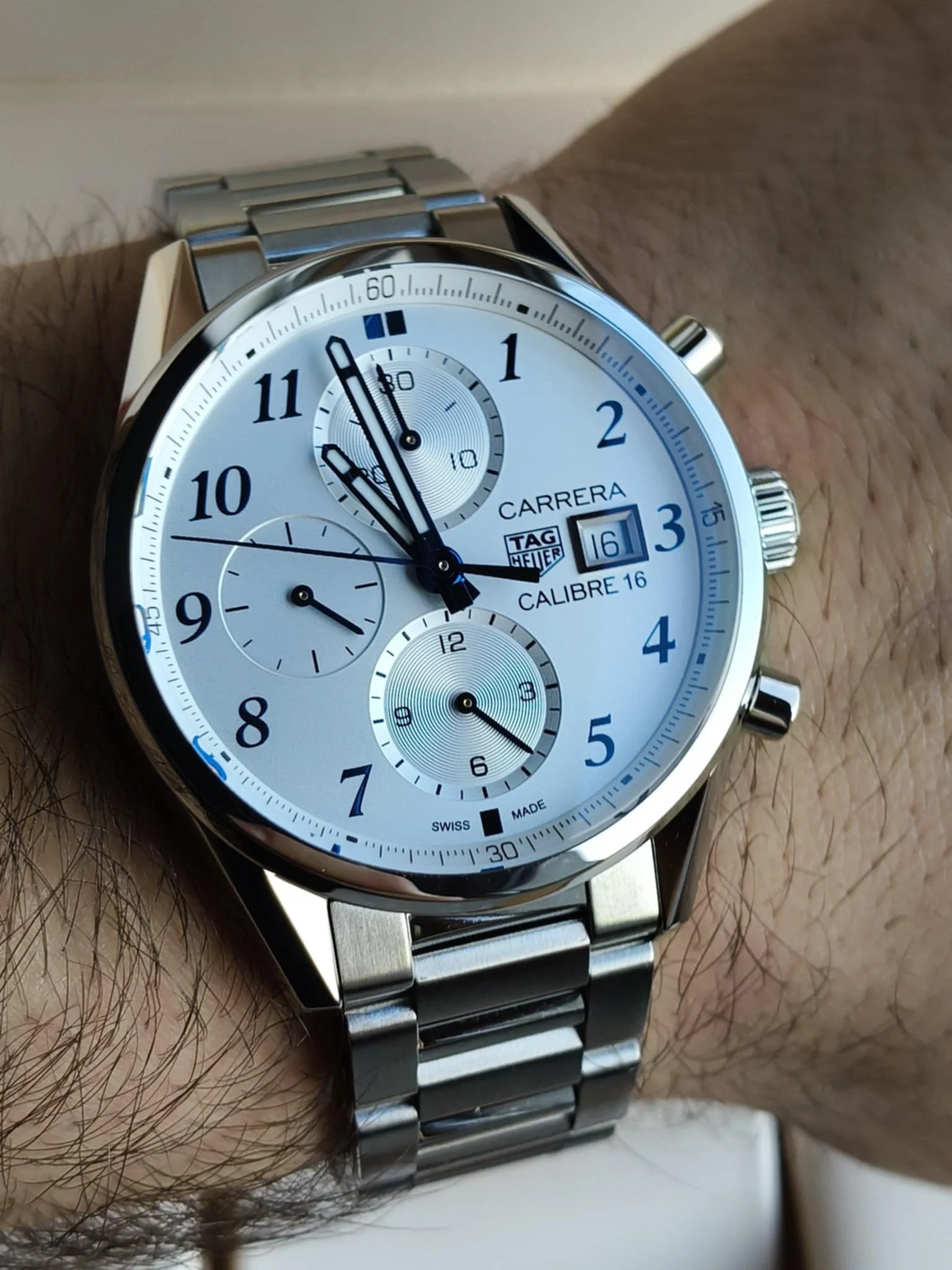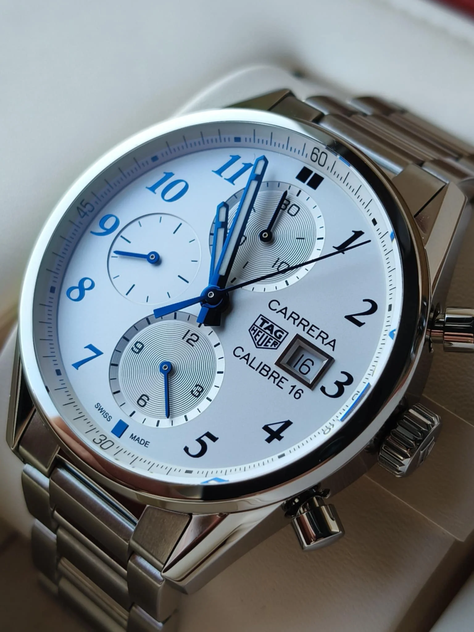 Koperta o średnicy 41 mm, wykonana ze stali nierdzewnej, prezentuje klasyczne, harmonijne proporcje, które idealnie układają się na nadgarstku. Smukłe, ostro zarysowane uszy oraz połączenie powierzchni szczotkowanych i polerowanych nadają zegarkowi sportowo-elegancki charakter, wierny ponadczasowej estetyce linii Carrera. Stała luneta z polerowanej stali subtelnie podkreśla wyścigowy rodowód modelu, a wodoszczelność do 100 metrów zapewnia swobodę użytkowania w codziennych warunkach.