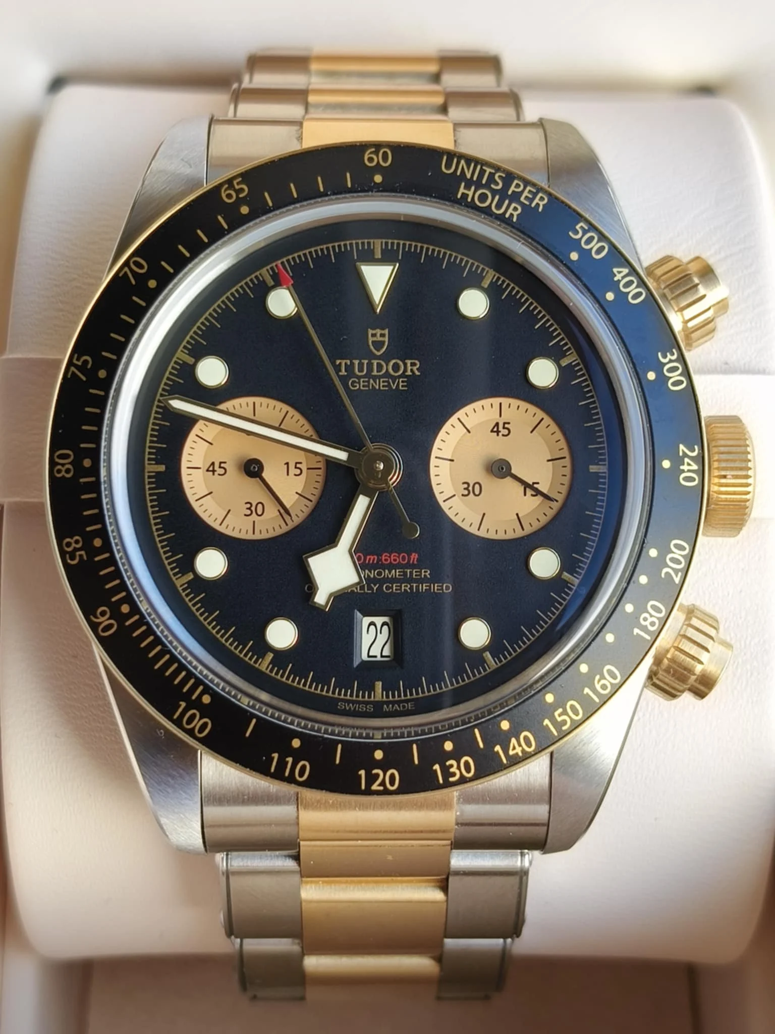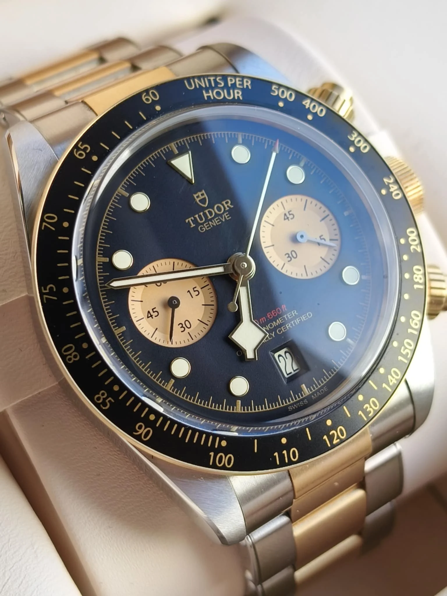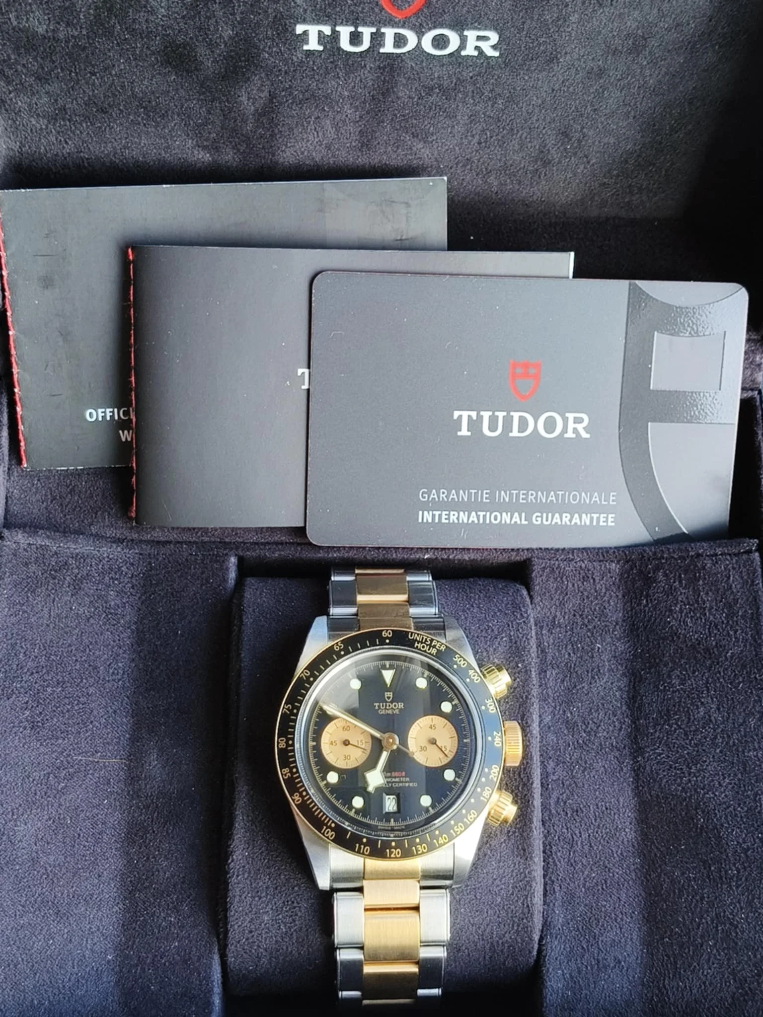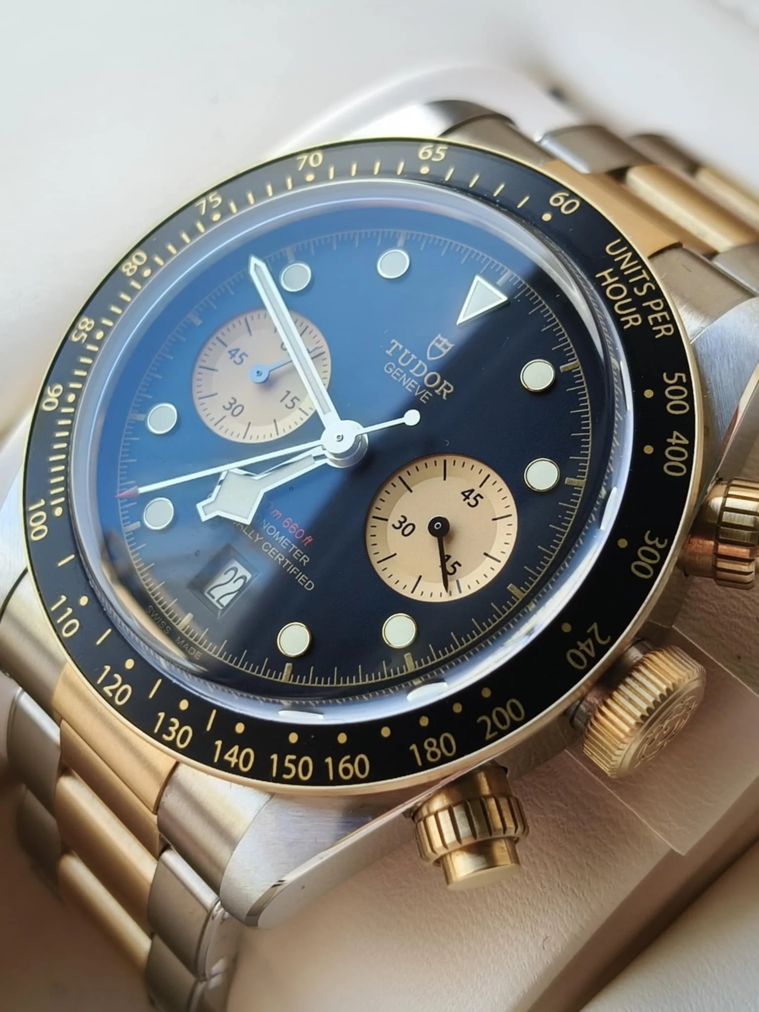 Tudor Black Bay Chrono M79363N-0001 to zegarek, który harmonijnie łączy sportową funkcjonalność, retro-estetykę i nowoczesną technologię manufakturową. Dwukolorowa koperta, kontrastowa tarcza typu panda i zaawansowany mechanizm z kołem kolumnowym czynią z niego wszechstronny czasomierz — idealny zarówno jako mocny element kolekcji, jak i zegarek do codziennego, aktywnego noszenia.
