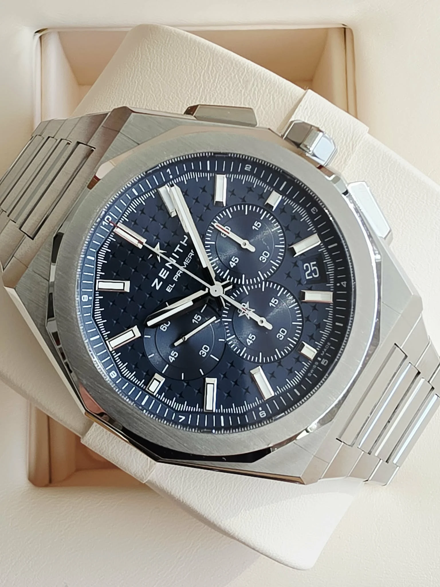 Srebrzysta tarcza typu sector dial zachwyca subtelną grą faktur — opalinowy środek kontrastuje z satynowanym, promieniście szczotkowanym pierścieniem zewnętrznym. Zestawienie arabskich cyfr i indeksów batonowych nadaje kompozycji dynamiczny, a zarazem klasyczny charakter. Wskazówki oraz indeksy z 18-karatowego złota zostały pokryte masą luminescencyjną, zapewniając czytelność w różnych warunkach oświetleniowych. Okienko daty umieszczone na godzinie 3 dopełnia funkcjonalny i harmonijny układ tarczy.