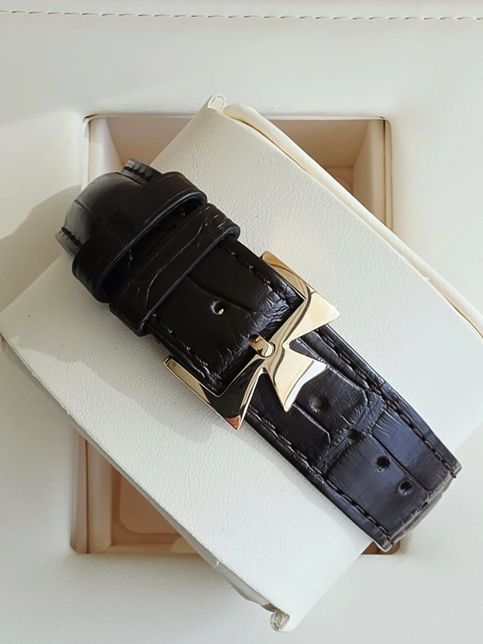 Model uzupełnia elegancki pasek z brązowej skóry aligatora z klamrą wykonaną z 18-karatowego różowego złota. Całość tworzy wyrafinowaną kompozycję, która doskonale łączy klasyczną elegancję z subtelnym, współczesnym charakterem.
