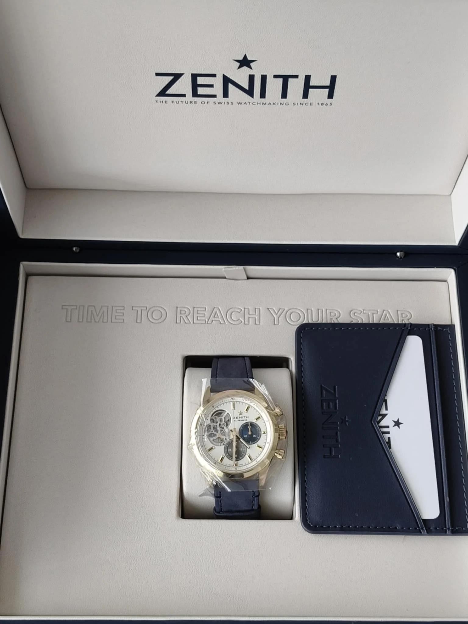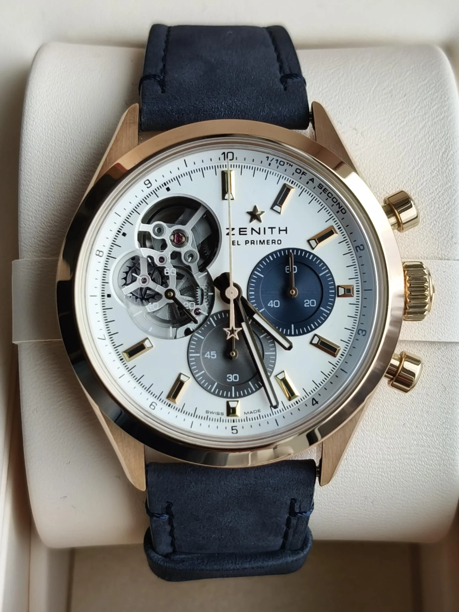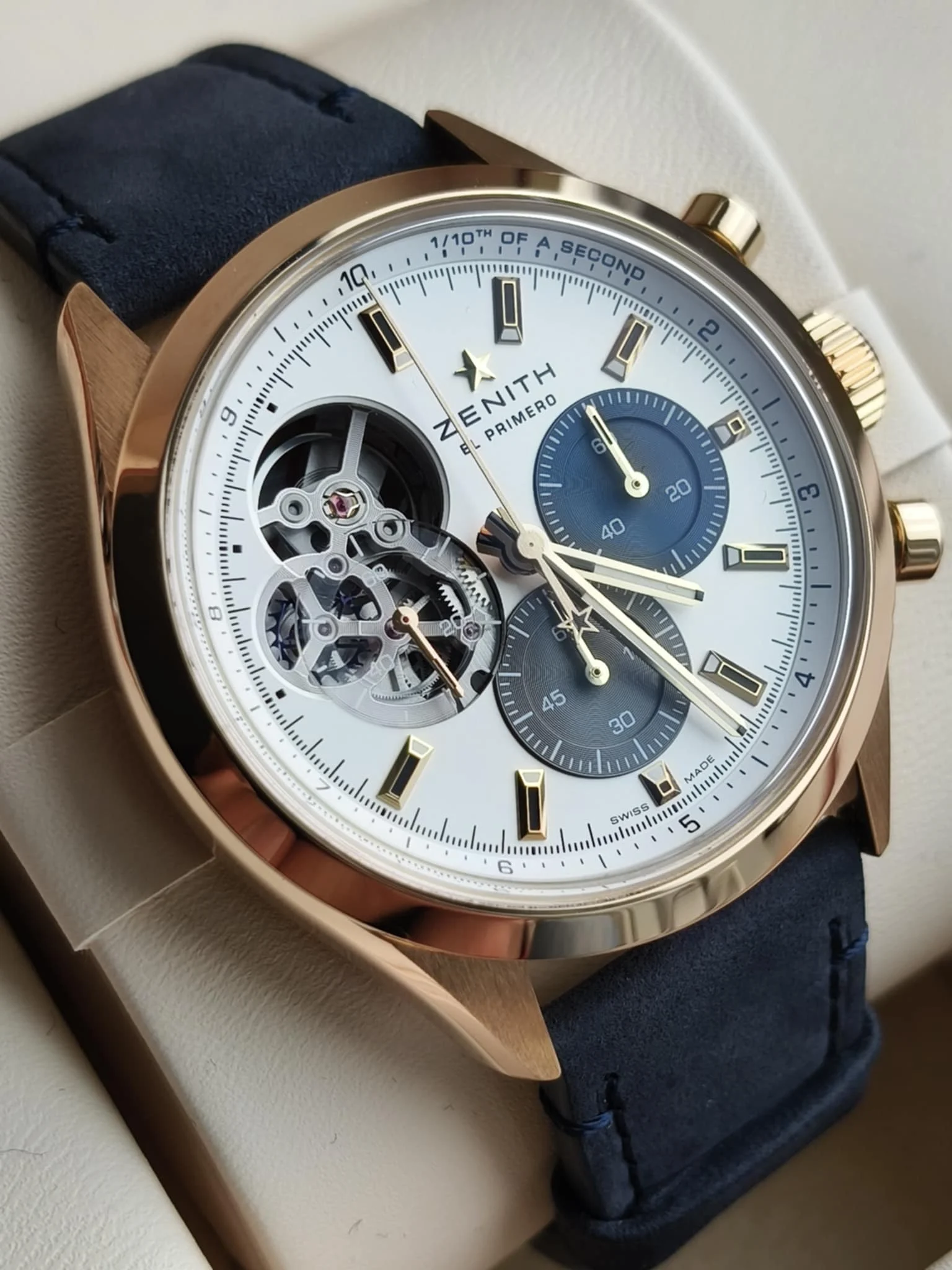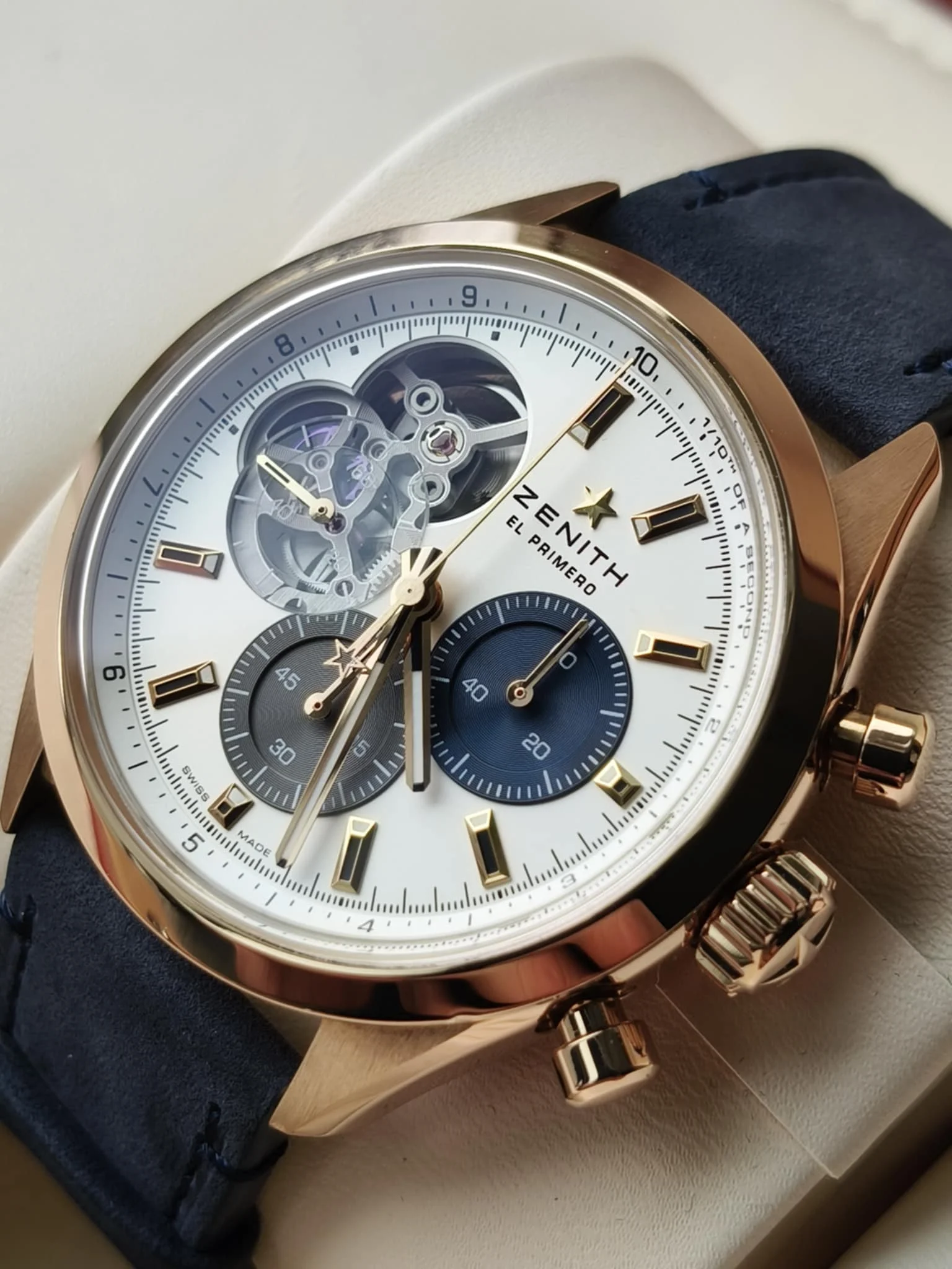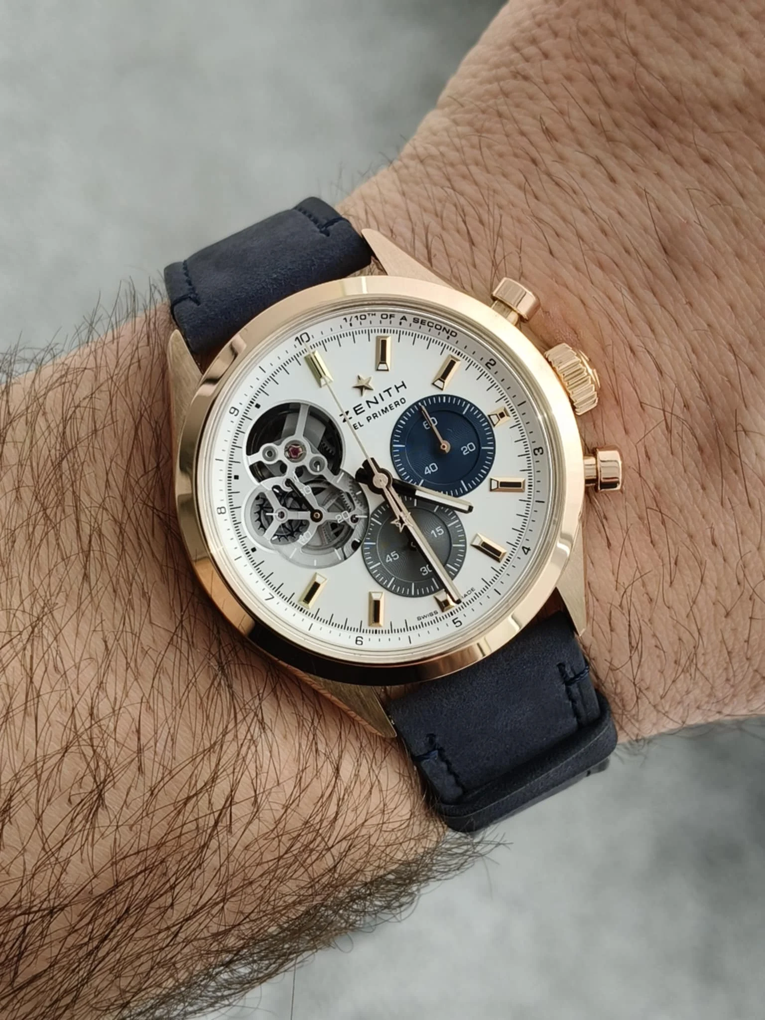 Koperta o średnicy 39,5 mm wykonana z 18-karatowego różowego złota emanuje ciepłem i klasą. To rozmiar idealnie wyważony — wystarczająco wyrazisty, by przyciągać spojrzenia, a jednocześnie elegancki i harmonijny na nadgarstku. Smukłe uszy i dopracowane wykończenia powierzchni podkreślają wysoką kulturę wykonania, z której słynie manufaktura Zenith.