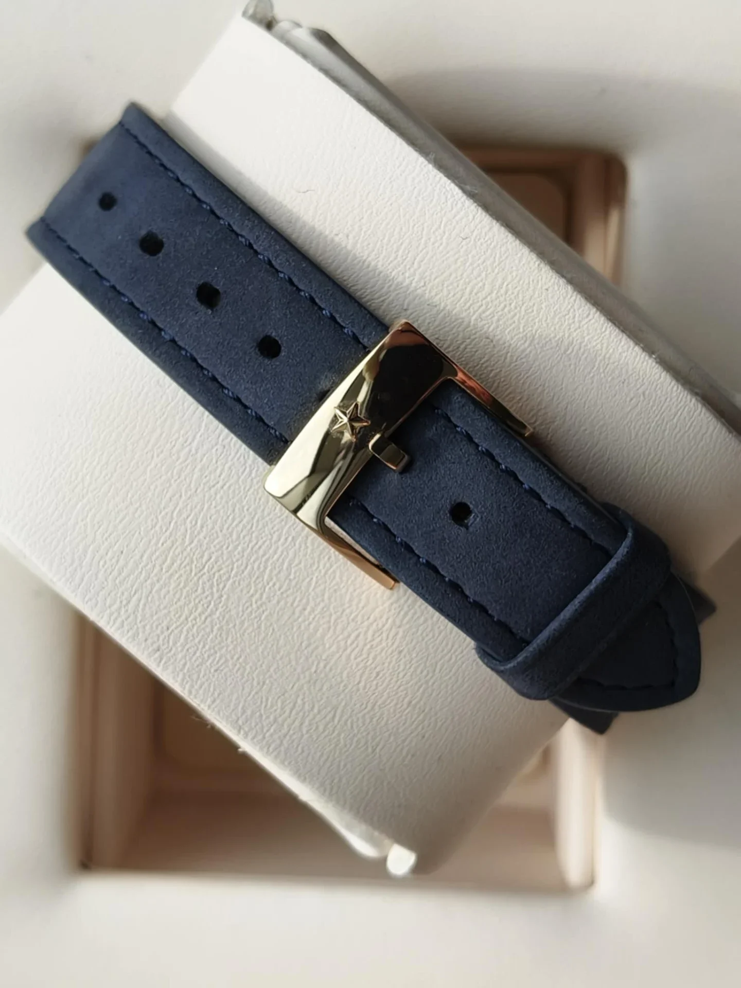 Całość dopełnia niebieski pasek ze skóry cielęcej, podszyty gumą dla większego komfortu i trwałości. To połączenie klasyki z nowoczesną funkcjonalnością — miękkości, która idzie w parze z wytrzymałością.