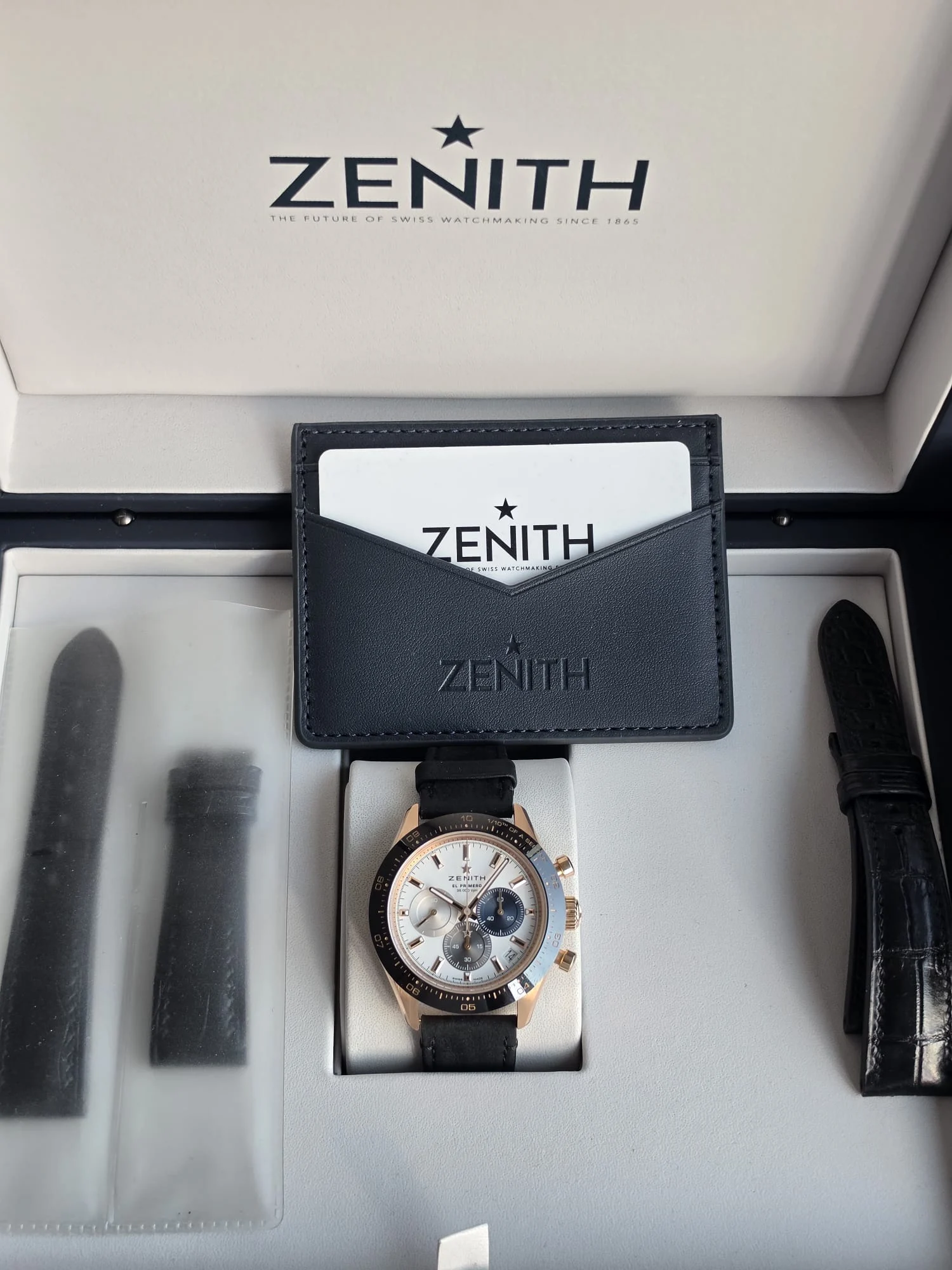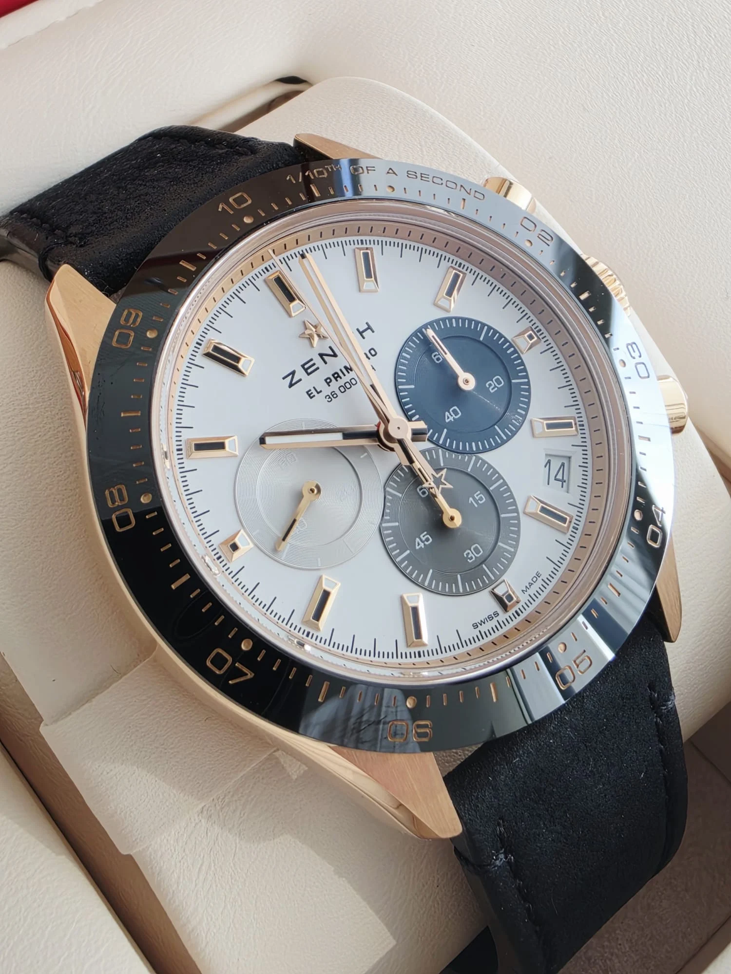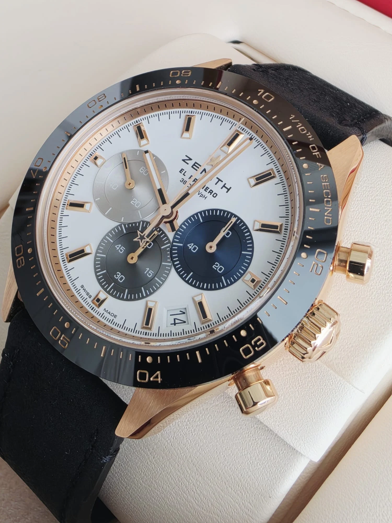 Zenith Chronomaster Sport 18.3100.3600/69.C920 to kwintesencja sportowego chronografu z legendarnym mechanizmem El Primero. Dynamiczna koperta o średnicy 41 mm z różowego 18-karatowego złota skrywa legendarny mechanizm El Primero 3600 z wysoką częstotliwością 36,000 półwahań na godzinę, umożliwiający pomiar czasu z dokładnością do 1/10 sekundy. Biała tarcza z charakterystycznymi, trójkolorowymi subtarczami chronografu nawiązuje do historycznego dziedzictwa marki. Doskonale czytelna skala 1/10 sekundy na lunecie umożliwia precyzyjny odczyt ultraszybkich pomiarów. Przeszklony dekiel pozwala podziwiać legendarny mechanizm z charakterystycznym niebieskim kołem kolumnowym. Wodoszczelność do 100 metrów oraz bransoleta wykonana z 18-karatowego różowego złota z potrójnym zapięciem bezpieczeństwa dopełniają sportowy charakter tego nowoczesnego chronografu. To propozycja dla prawdziwych entuzjastów zegarmistrzostwa, ceniących rewolucyjny mechanizm El Primero.