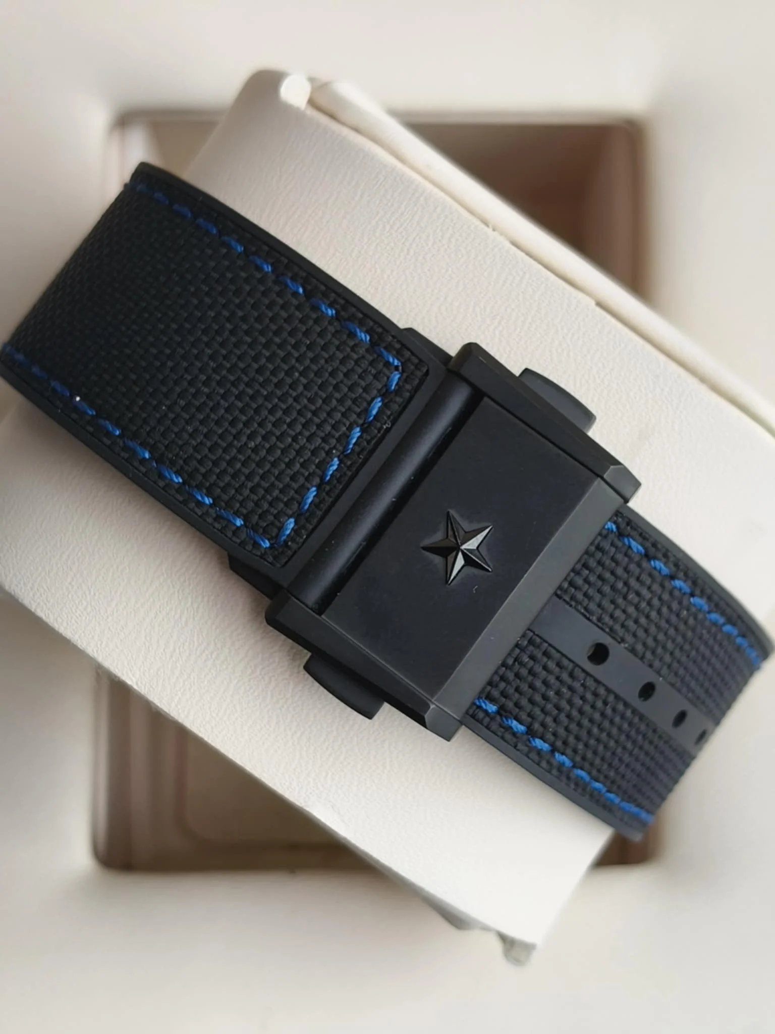 Zegarek zestawiono z wysokiej klasy paskiem ze skóry aligatora z gumowym oparciem, często z akcentami w odcieniu niebieskim — detale te podkreślają sportowo-luksusowy charakter modelu, łącząc komfort noszenia z elegancją. Całość spinana jest tytanową klamrą z powłoką DLC, która zapewnia bezpieczeństwo i trwałość na co dzień.