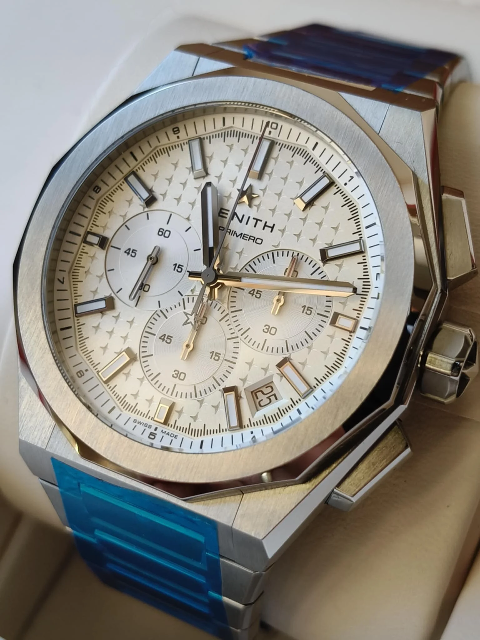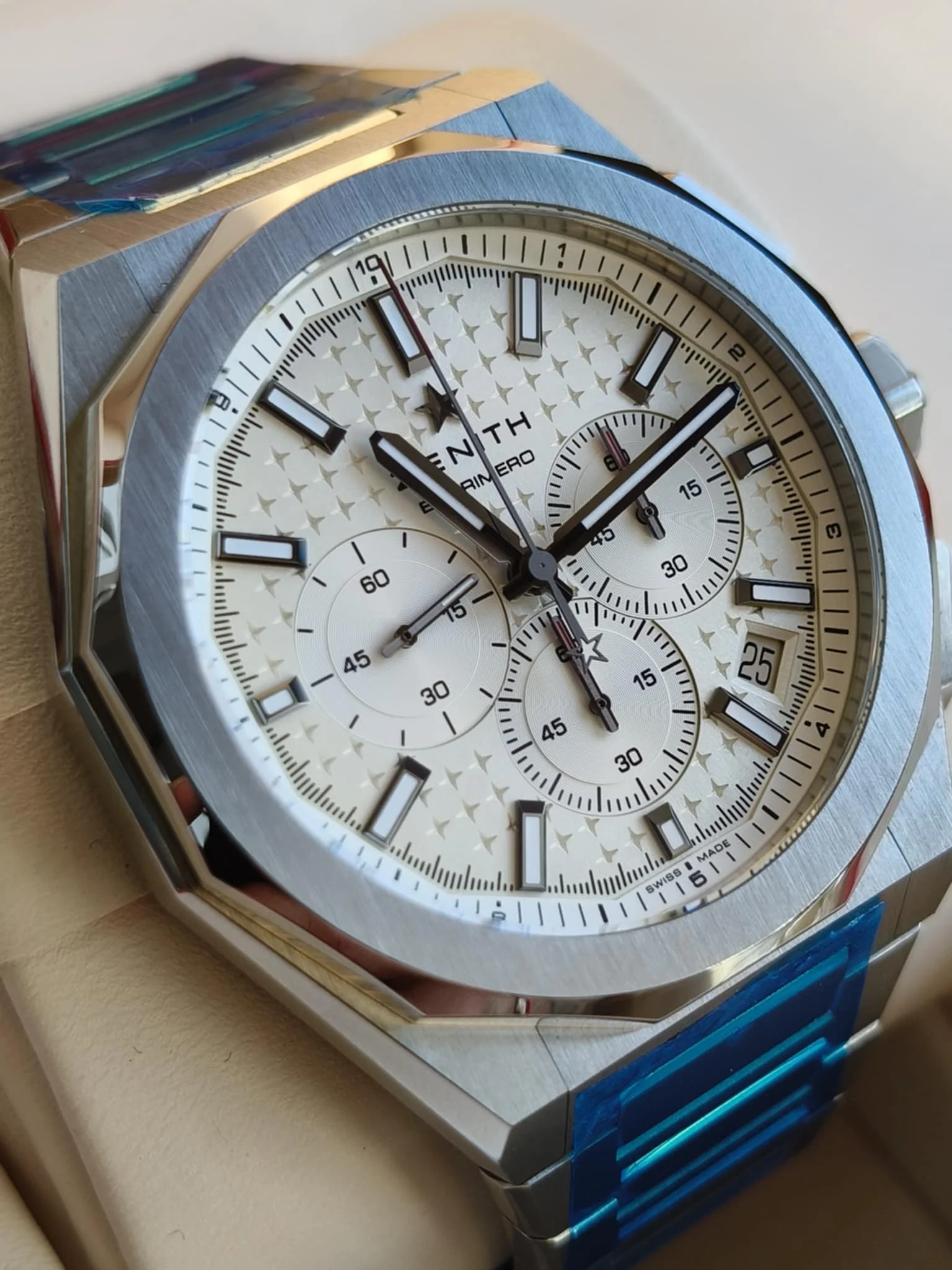 Srebrzysta tarcza przyciąga wzrok subtelnym, grawerowanym motywem gwiazd – znakiem rozpoznawczym linii Defy. Trójlicznikowy układ chronografu został harmonijnie zintegrowany z tarczą, zachowując jej czytelność i nowoczesną estetykę. Nakładane indeksy oraz fasetowane wskazówki, wypełnione substancją Super-LumiNova, gwarantują doskonałą widoczność w każdych warunkach. Okienko daty umieszczone na godzinie 4:30 dodaje funkcjonalności, nie zaburzając wizualnej równowagi projektu.