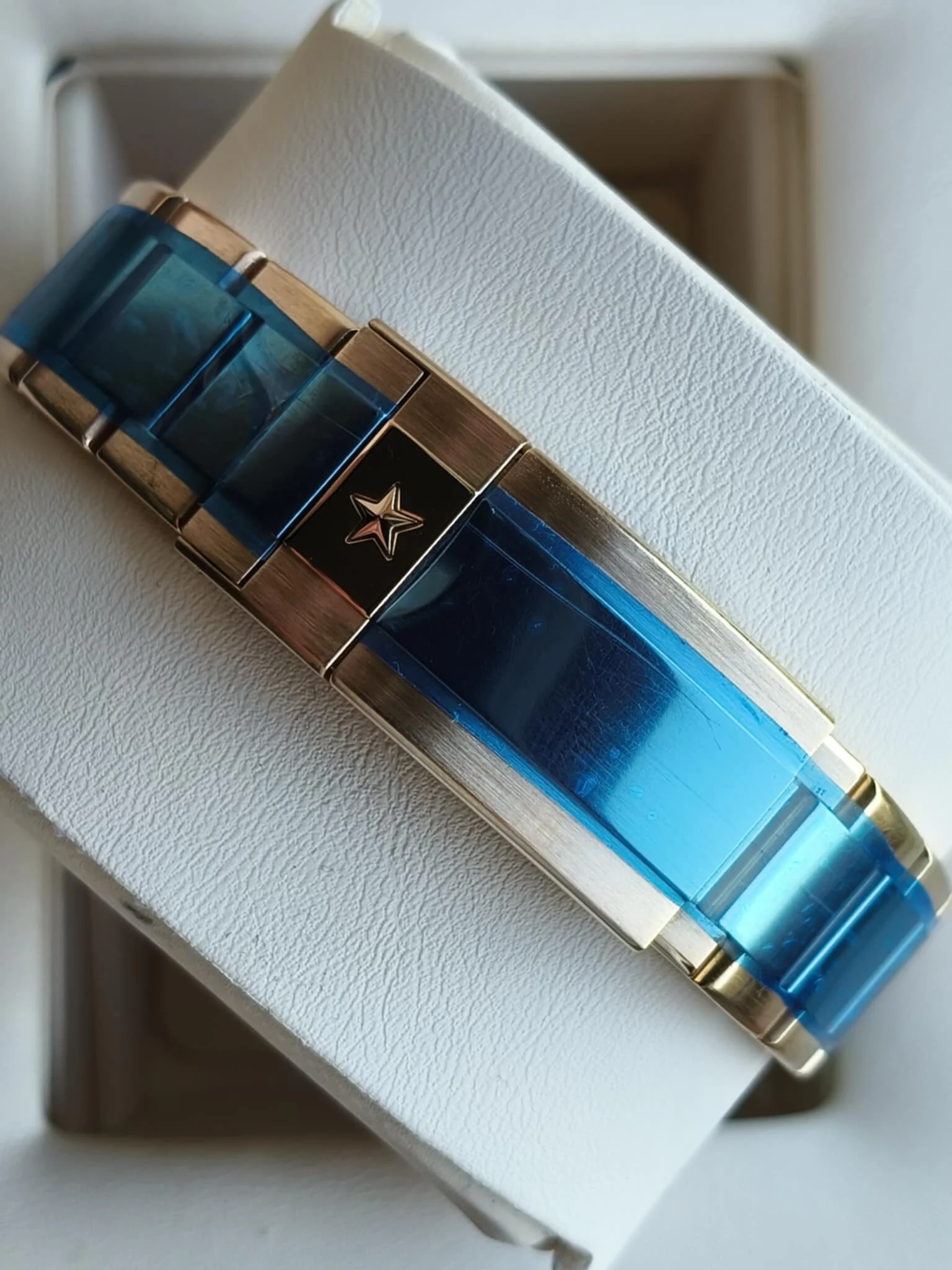 Zestaw zawiera również dodatkowy oryginalny skórzany pasek ze złotym zapięciem motylkowym.